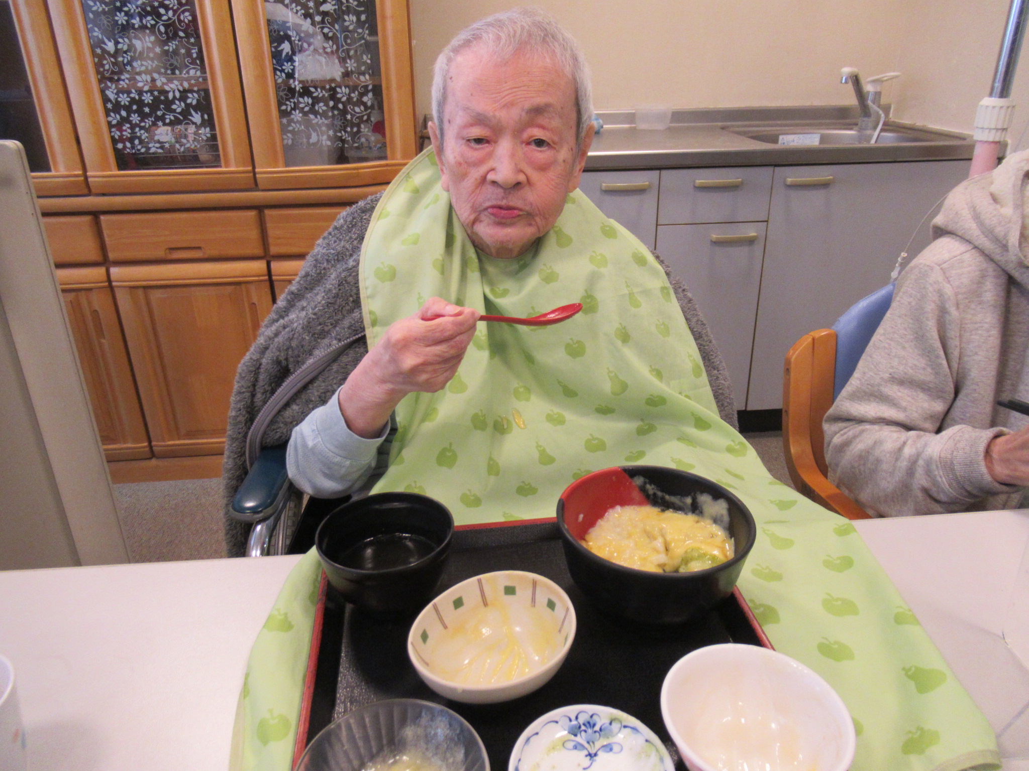 今日のメニューは、ご飯・ワンタンスープ・かに玉あんかけ・冬瓜の煮物・漬物・フルーツでした。