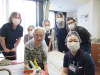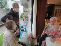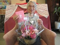娘さんご夫婦が会いに来てくださり、お花のプレゼントをもらって大喜びしてました。