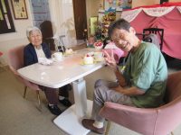 ご家族からプレゼントが届き、仲の良い入居者様とケーキとコーヒーでお祝いしました。