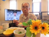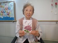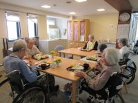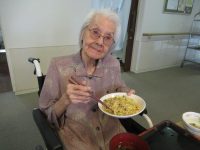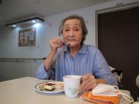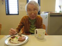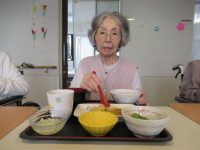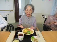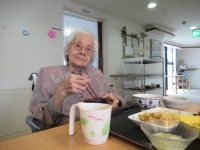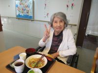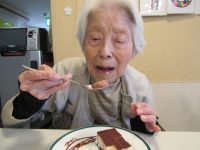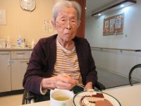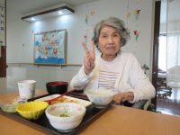 食事前に、女性の入居者様から「おめでと~」と言われ照れていらっしゃいました。