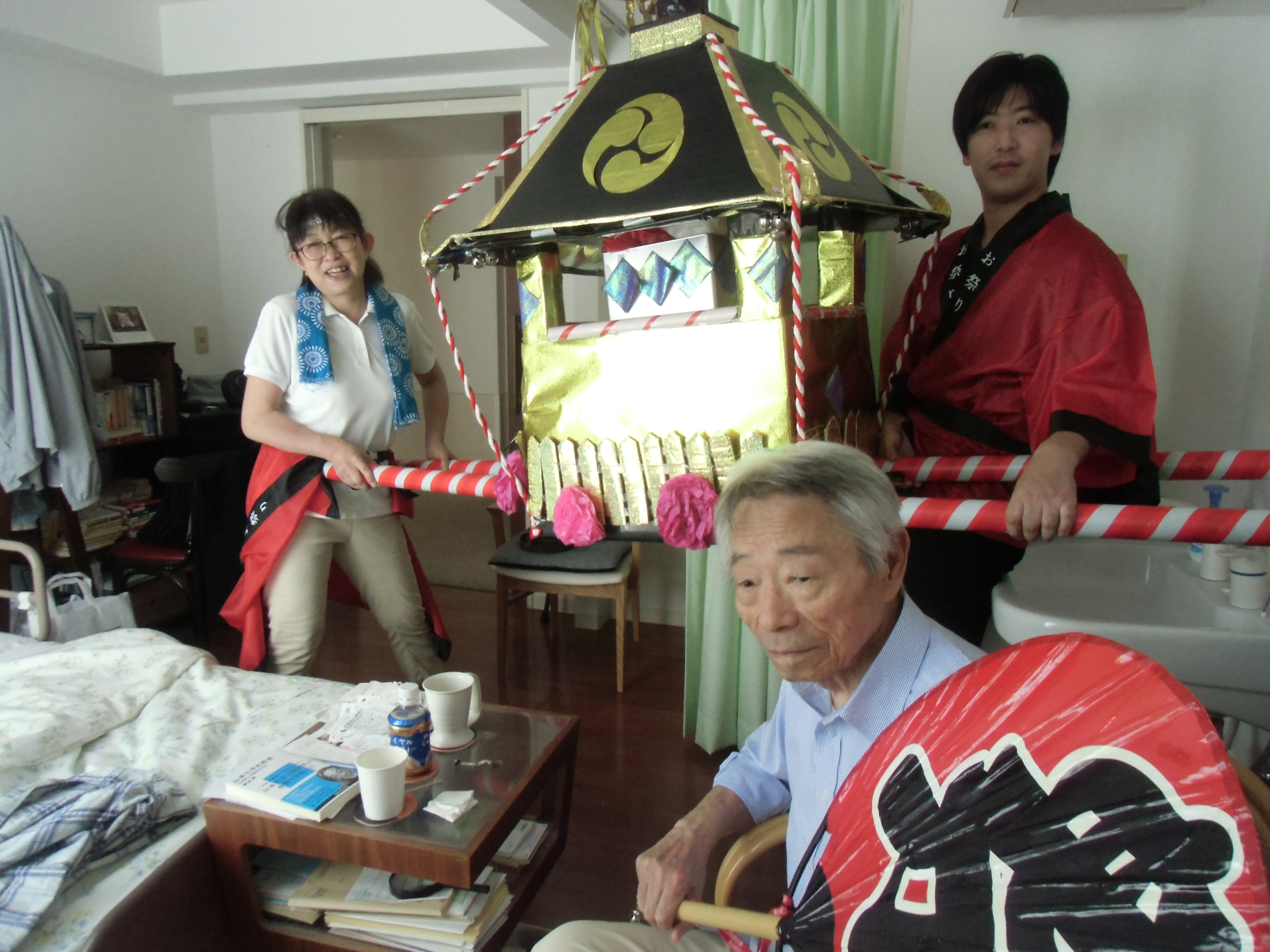 午前中は各居室をスタッフが神輿を担いでまわり、入居者様は驚くやら嬉しいやら・・・