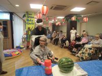 ご家族様が目隠しをして入居者様の車椅子を押すのですが、入居者様が誘導してスイカを割るというゲーム式です。