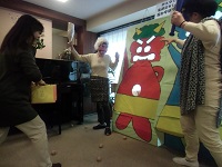 昨日は、来設されたお客様や入居者様に鬼のパネルに向かって豆を撒いて頂くイベントをしていましたが、それ以外にも寝たきりだったり身体が不自由な入居者様に対して、節分気分を味わって頂くべく、鬼に扮したスタッフに各居室を訪れてもらったりもしていました!!
