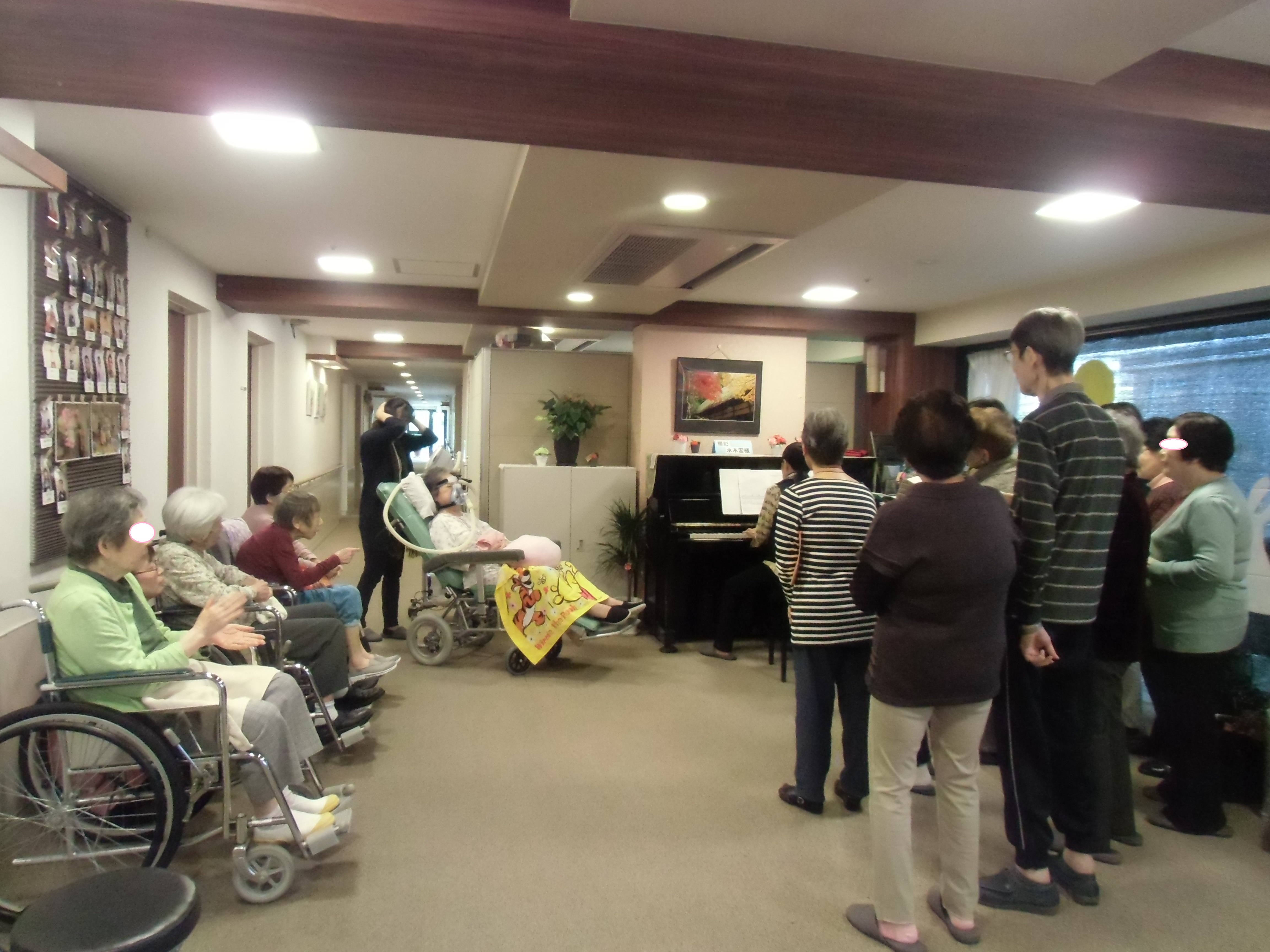 歌声を聴きつけた入居者様がだんだんと集まって、最後はみんなで合唱のようになっていました。