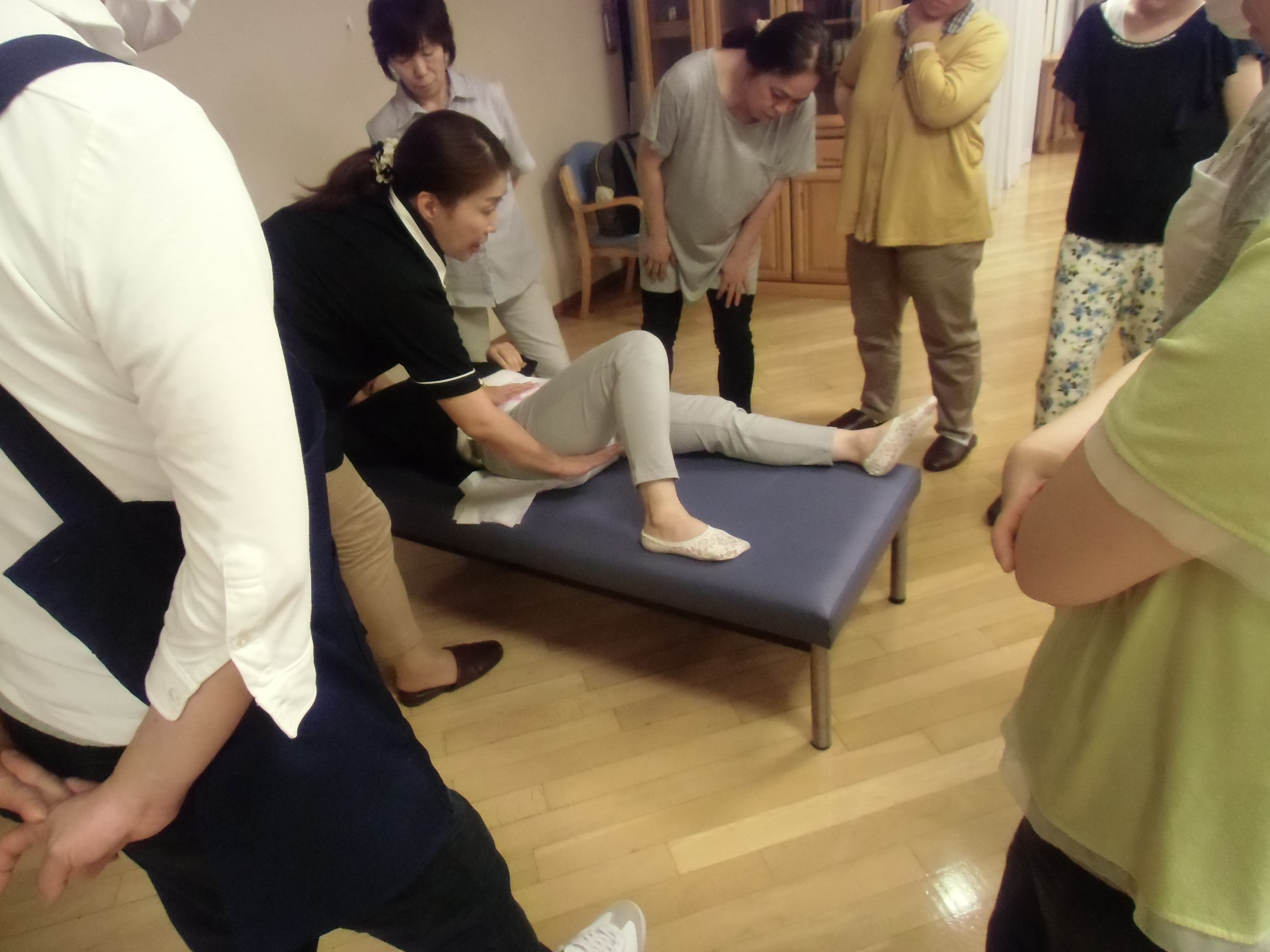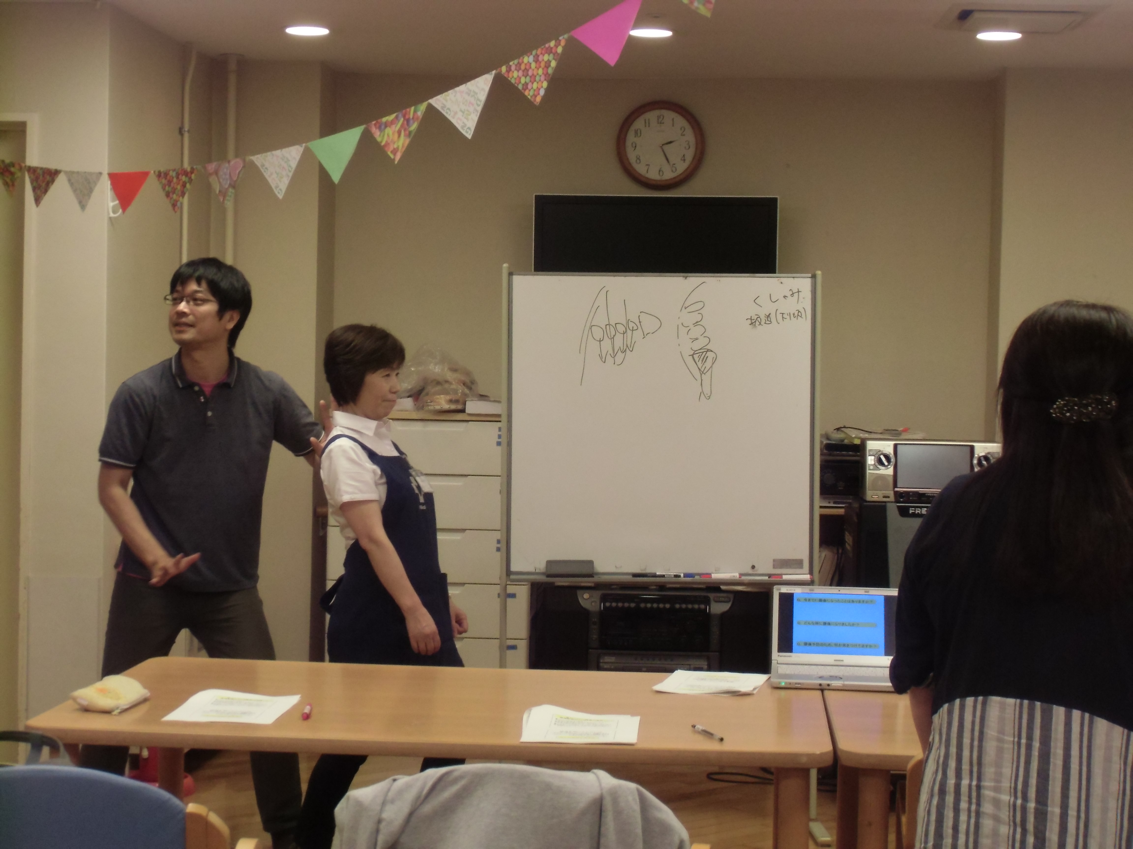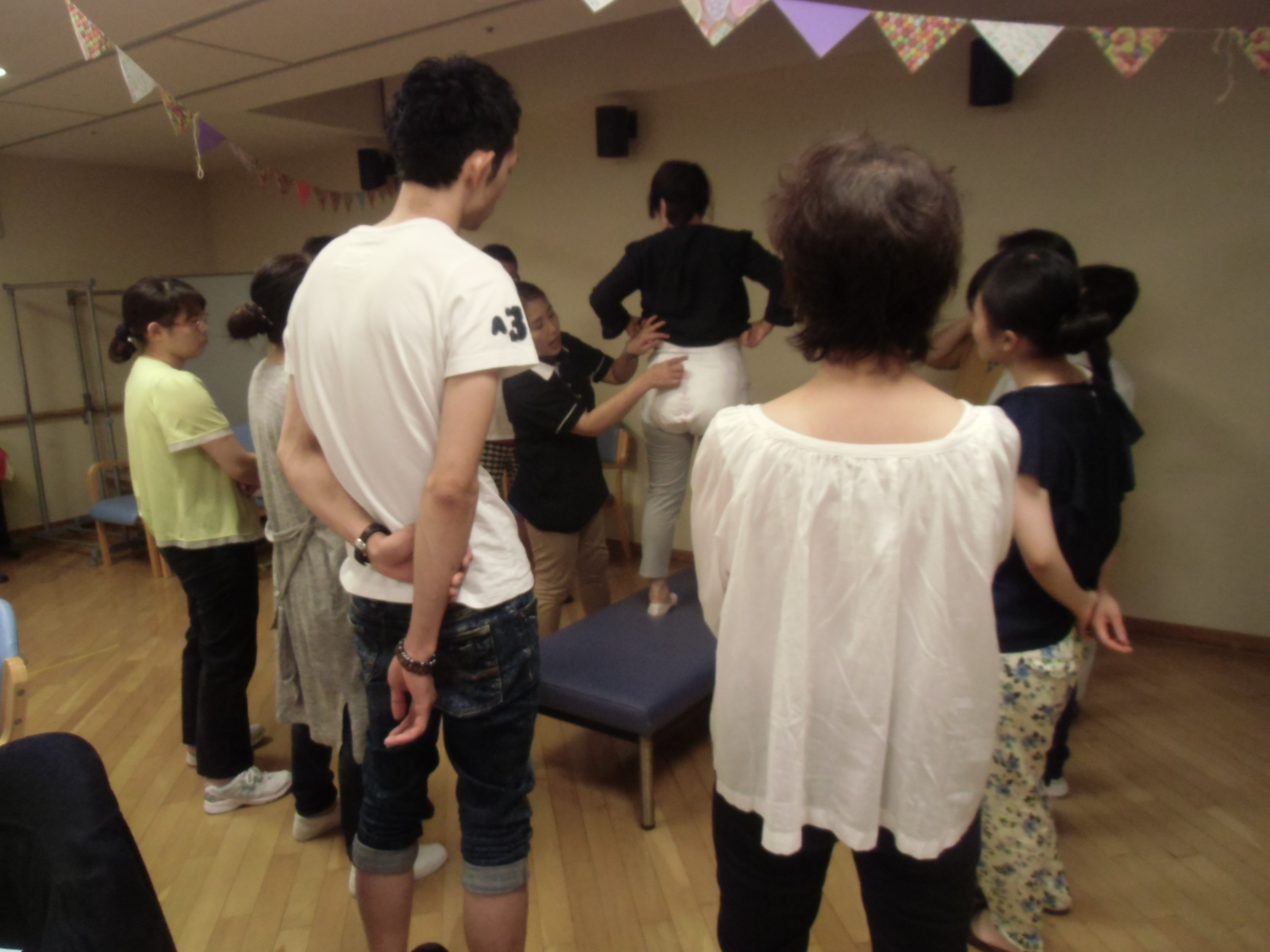 まずは講義、そして実技。全員でリハビリパンツをズボンの上から履いてみました。
