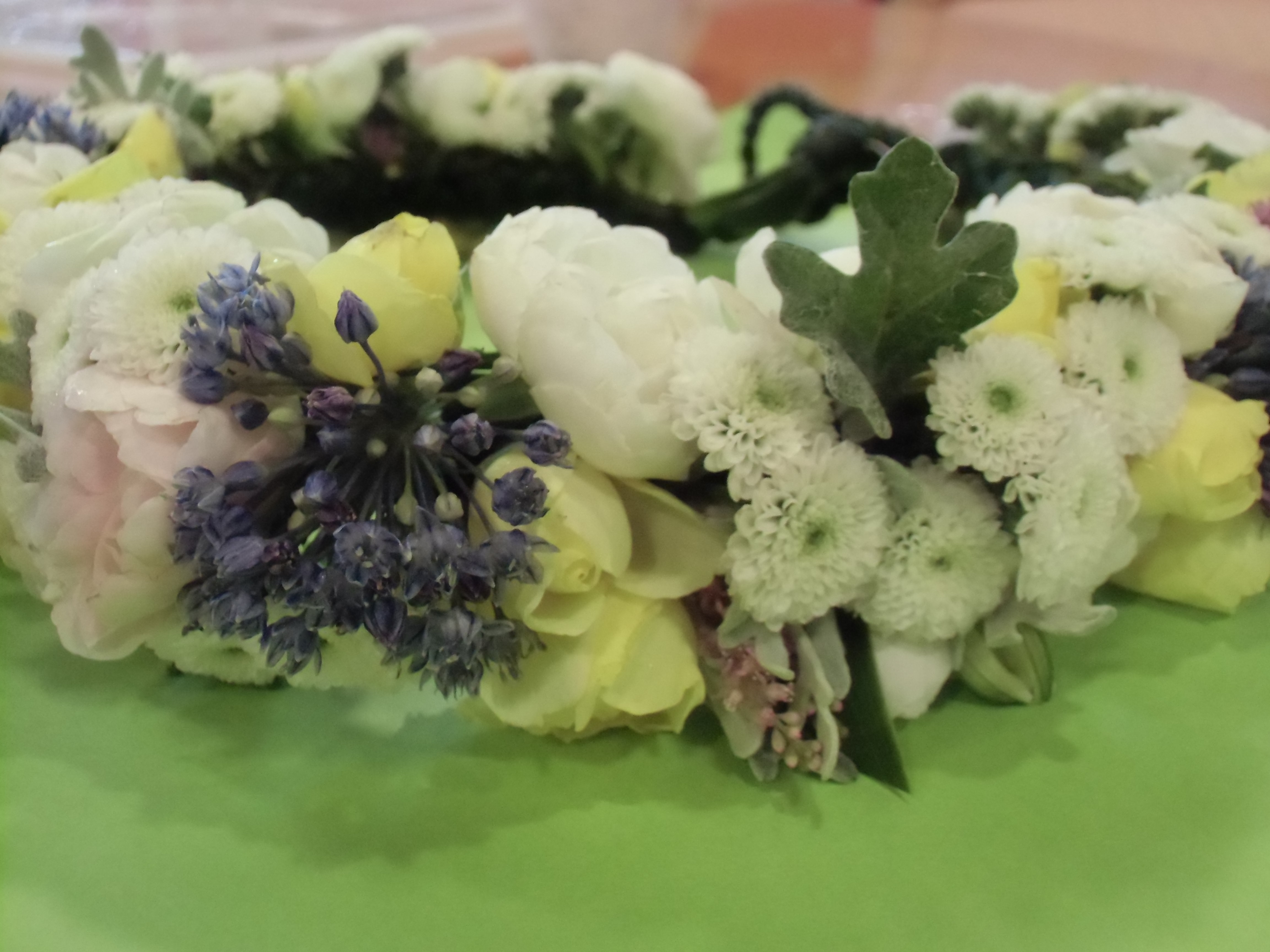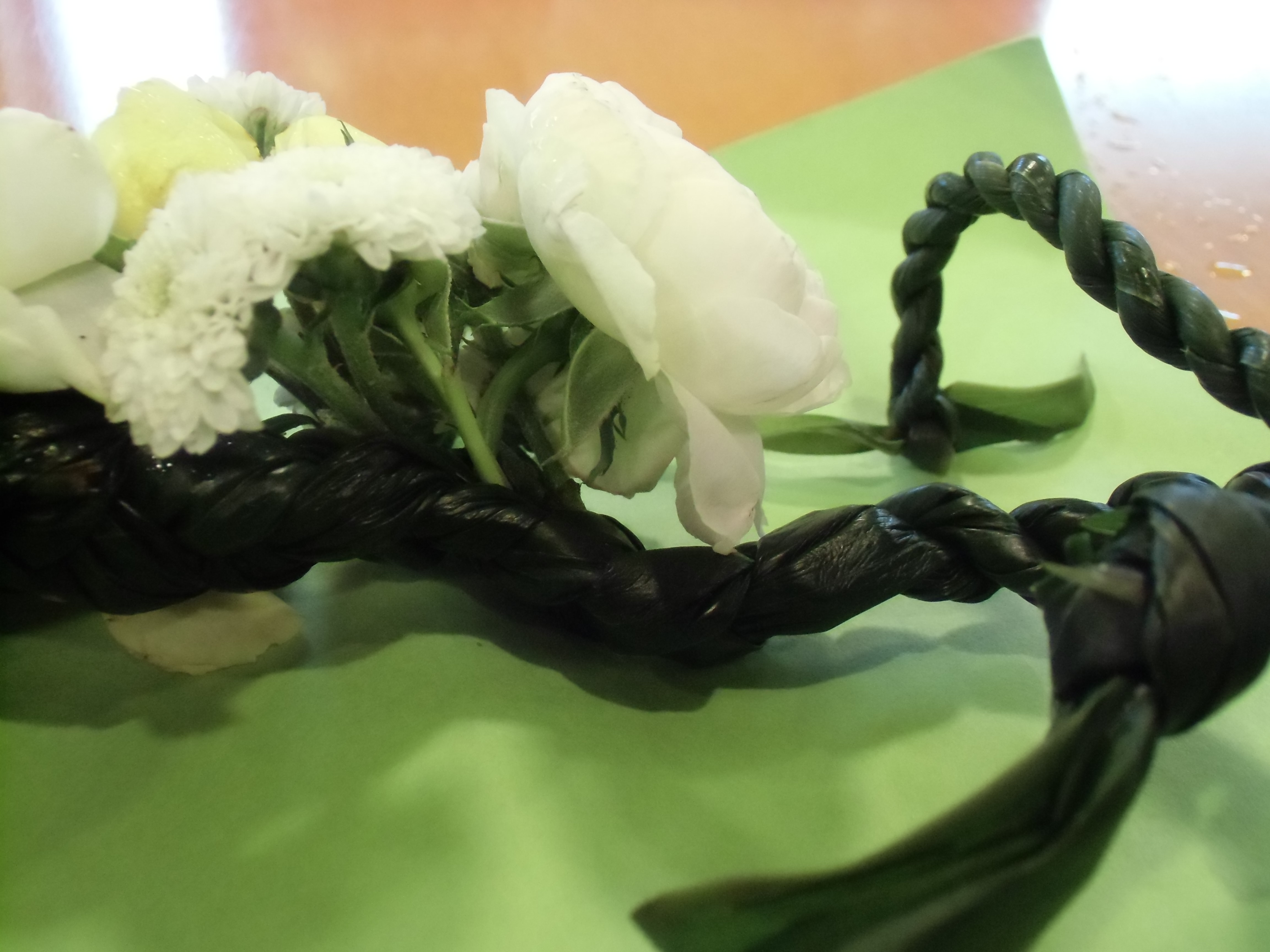 花をつないでいるのもリボンではなく、生の葉っぱ。ものすごく手の込んだもの。