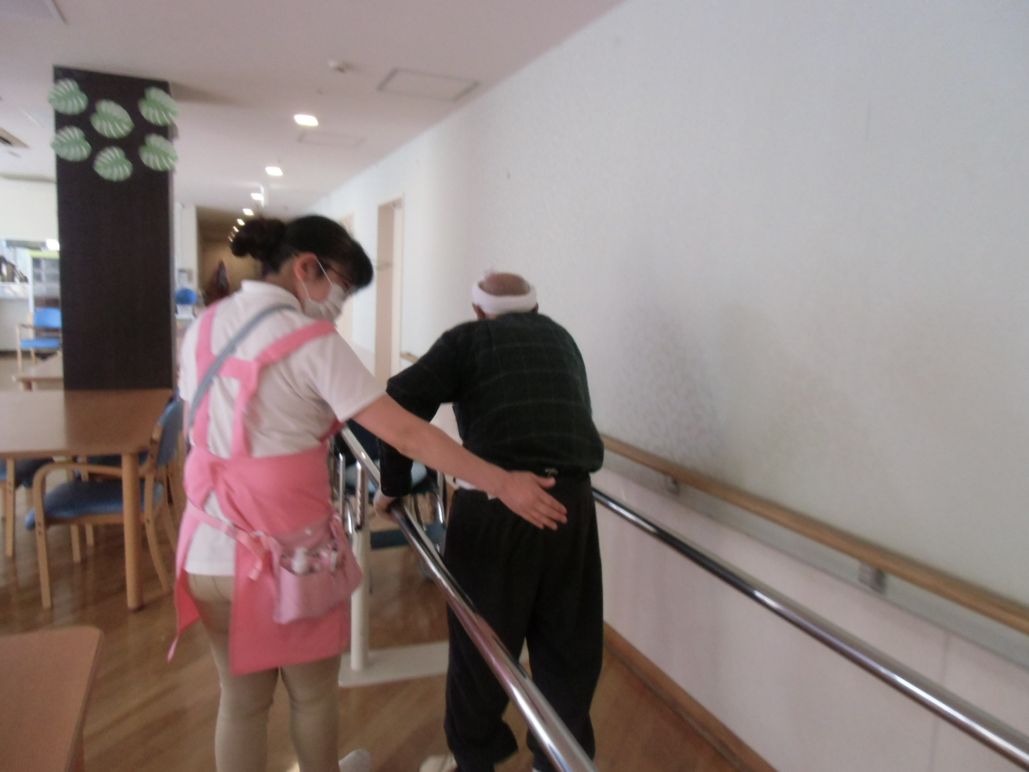 スタッフが入居者様の歩行リハビリに付き添っていました