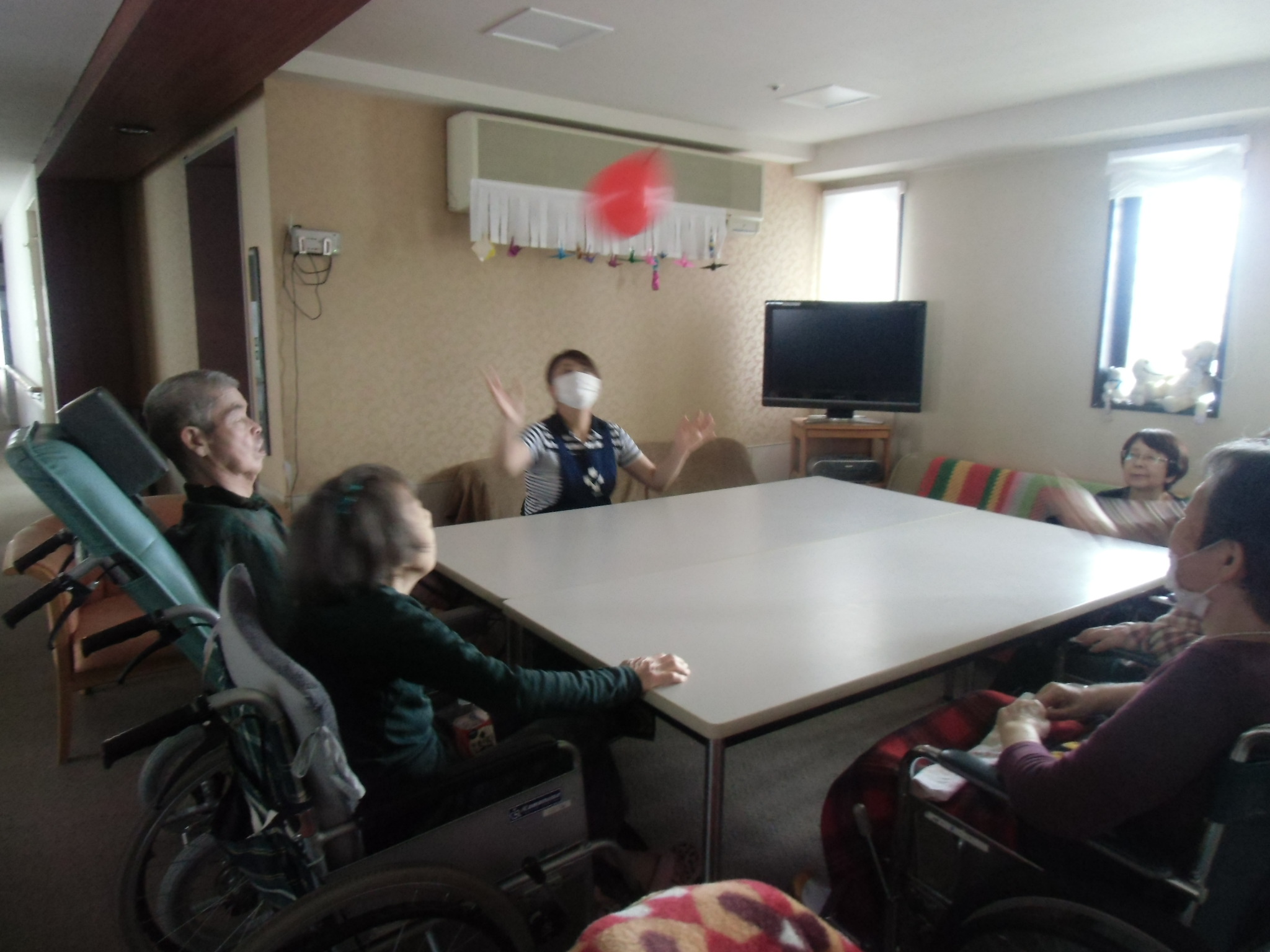 入居者様とスタッフで、2Fラウンジで風船バレーを楽しみました。