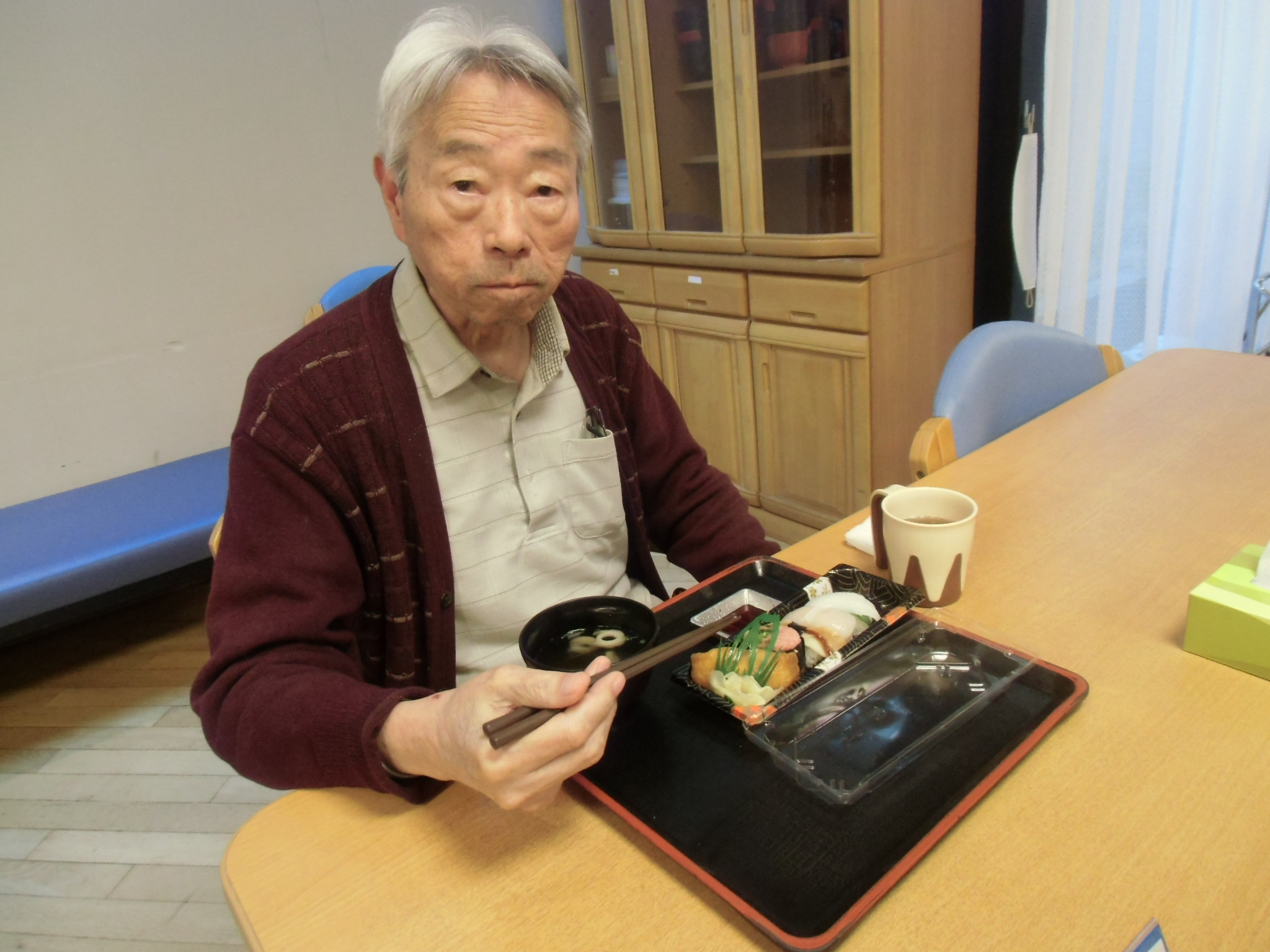 入居者様はお昼に恵方巻きを召し上がりました。おいしくて食べすぎた方も