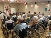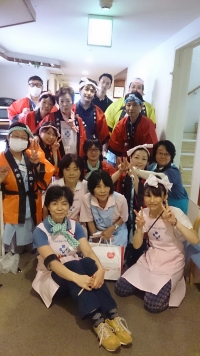 威勢よく練り歩く御神輿と漢たちは、ご入居者の前では「ピース」や「ガッツポーズ」などで写真をパチリ。