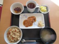 今日のメニューは、ご飯・スープ・挽肉カレー・シーザーサラダ・フルーツでした。