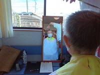 猛暑の中、大きな鏡を抱え床屋さんがやってきました。