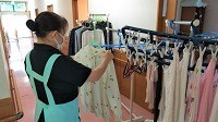 大量の洗濯物を1枚1枚丁寧に干してゆくスタッフ。