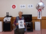 書道にて「令和」。くす玉を割り「令和」と共に写真撮影。