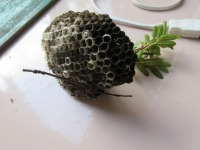 男性スタッフが、植木の中のハチの巣を見つけてくれて