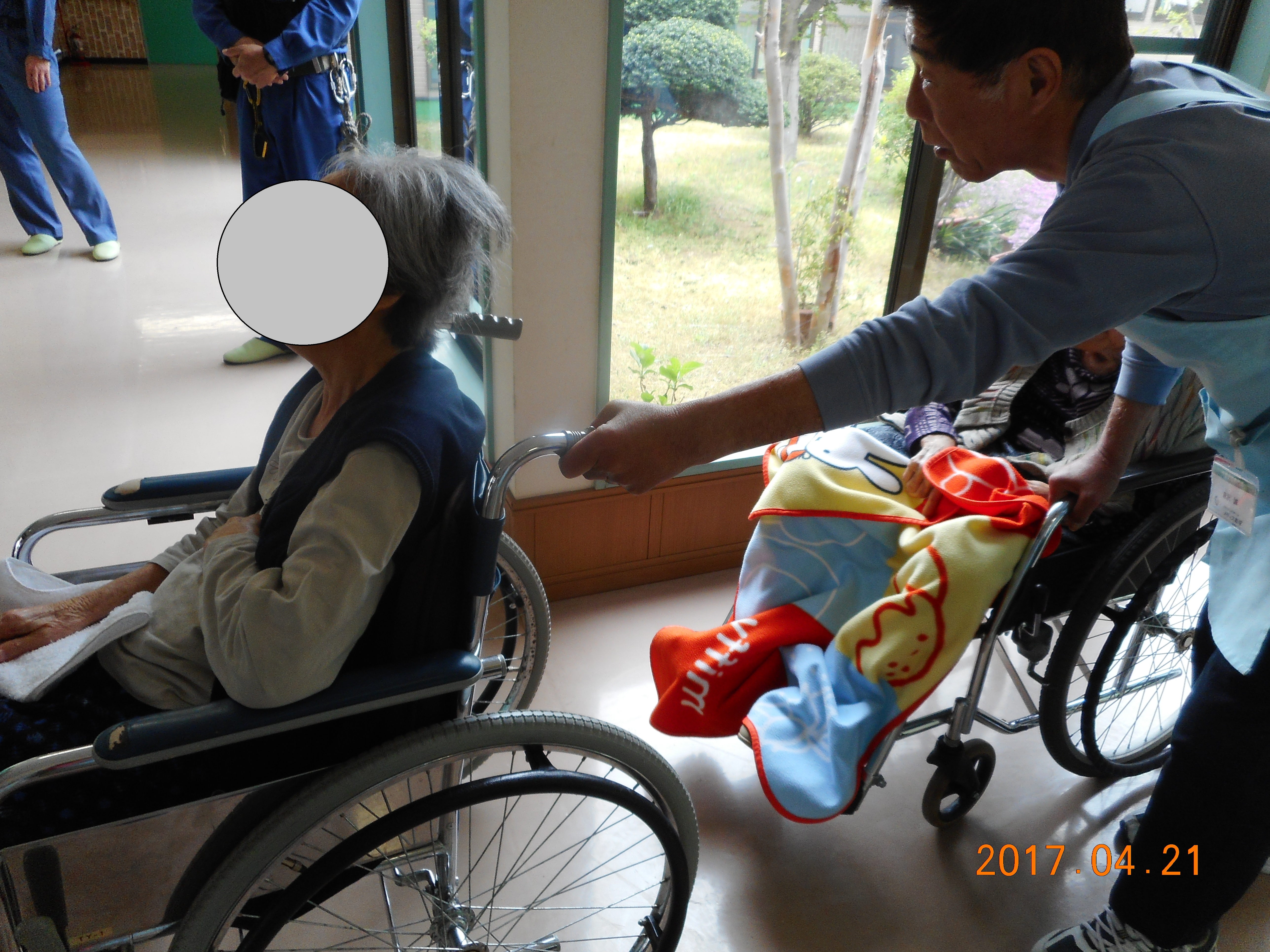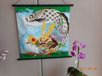 急いで端午の節句のタペストリーを施設内に飾りました。