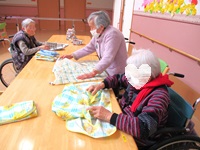 食事エプロンを畳むのをお手伝いしていただいています。