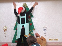 入居者様が作ったクリスマスツリーを慎重に壁に飾りました。