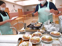 入居者様がホールに集まってくる前に、「紅茶の香りがする~♪」「美味しそう~♪」「生クリームしぼるの上手~♪」とちょっと楽しそうにお茶の準備をしているスタッフ達でした~(*^^*)