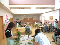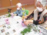 「フラワーアレンジメントなんてやったことないよ!」と話されていた入居者様も、いざ始めてみると迷いなくじゃんじゃん花をオアシスに挿していき、バランスを見ながら紅葉やサルスベリといった葉も使って隙間を埋めていらっしゃいましたよ(^^)