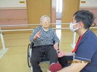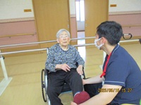 足のストレッチでちょっと険しい顔つきをしていた入居者様。