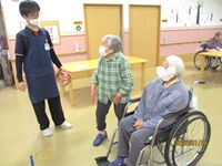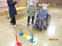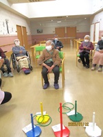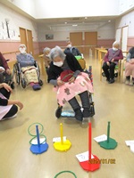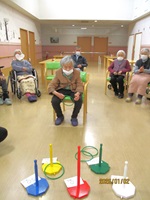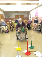 離れた場所から輪投げが的に命中しましたが、1個でも外れちゃうと「ん~・・」と納得いかない様子を見せていた入居者様です(*^^*)
