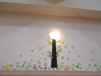 色を付けたら切り取って、壁にイチョウの葉を作りました!