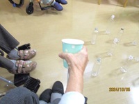 紙コップにつけたボールを振り子のようにしてペットボトルに当てるゲームをしています♪