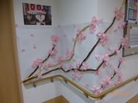 居室階の廊下にも桜が舞っているように花びらを飾っていますが、写真で見ると「なんじゃこりゃ、ピンクの点々?」って感じなので、掲載断念しました。