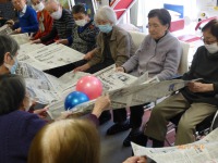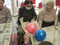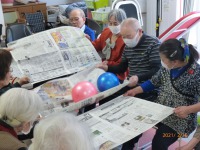 お互いが新聞の端を持ち合い、ボールを運びます。うまくやらないと、新聞が破けたり、隣の人との間でボールが落ちちゃったり