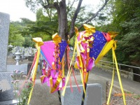 浄土真宗の安芸門徒のお墓には、お盆にいろいろな盆灯篭を飾って、祖先をお迎えします。