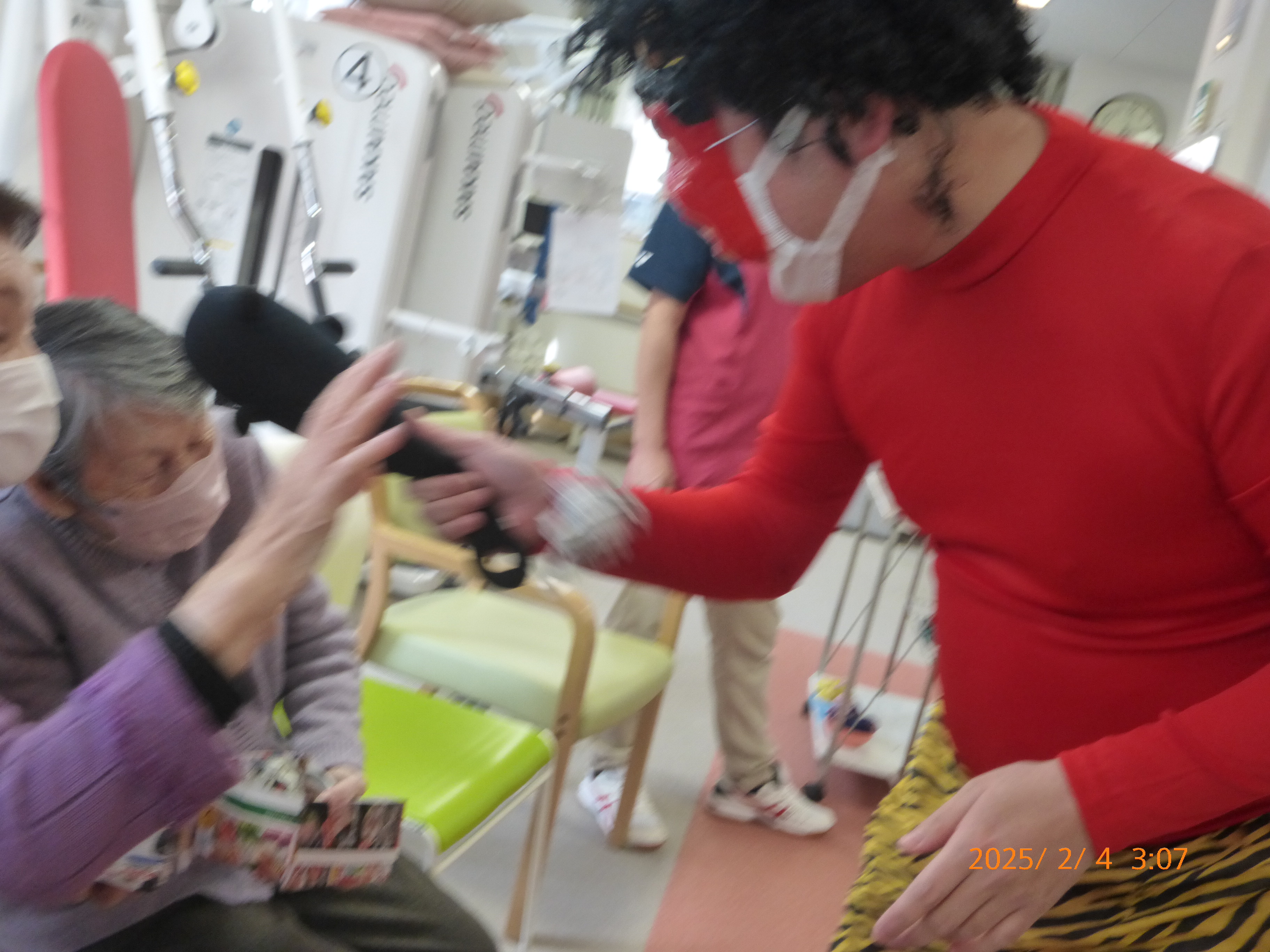 ご利用者様が新聞紙を丸めた豆を手作りされ 鬼にぶつけておられました。
