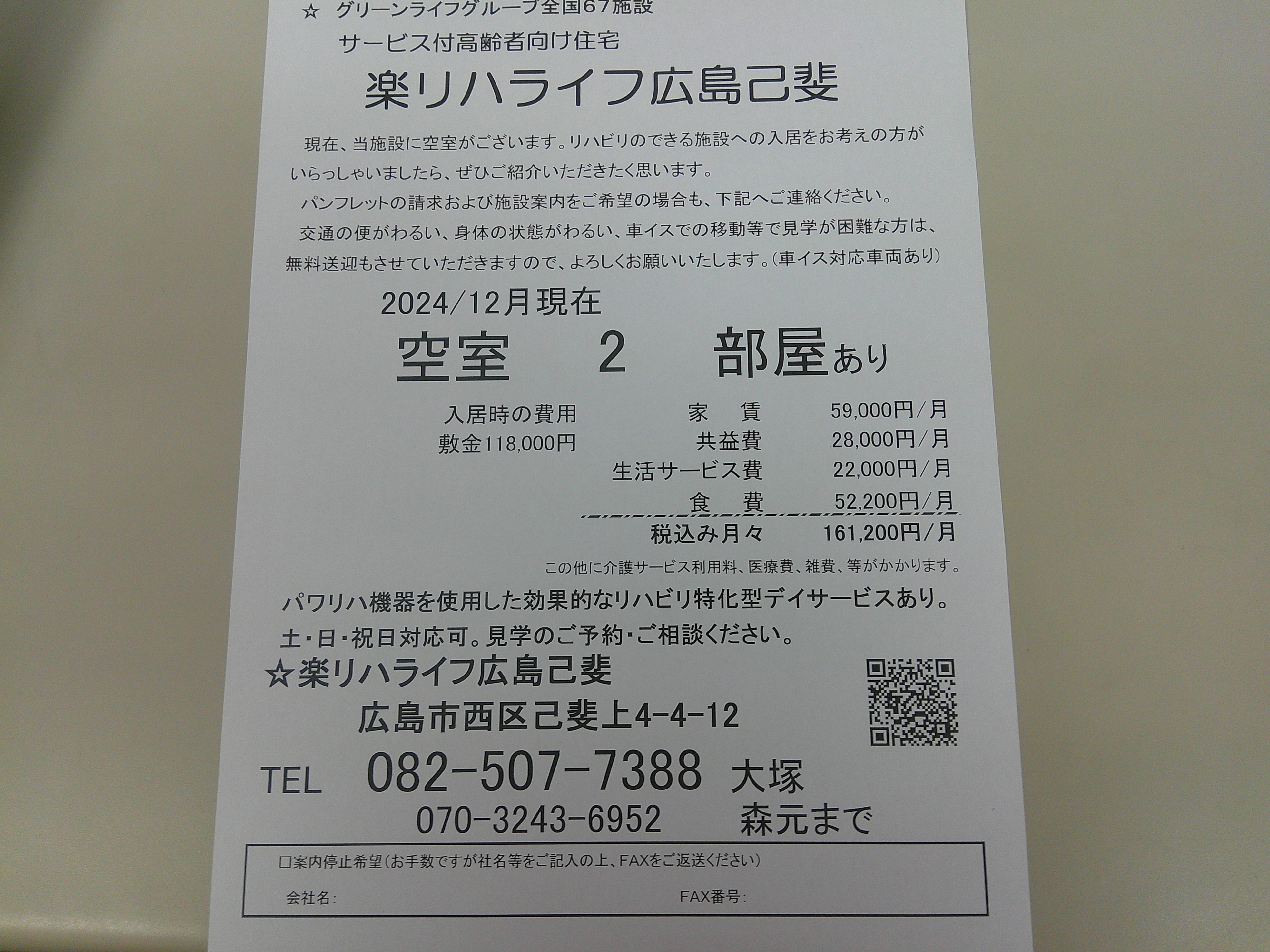 楽リハLIFE広島己斐では1部屋空きがございます。