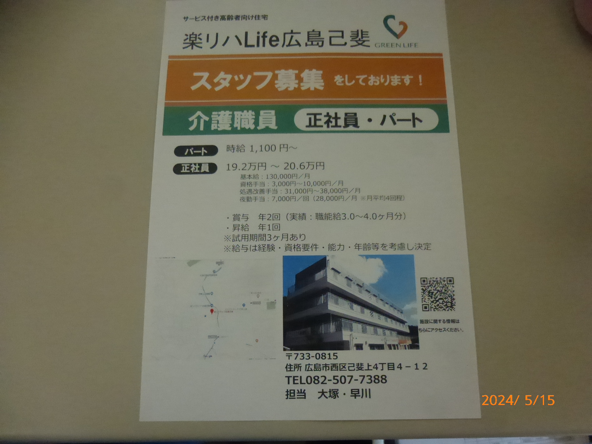 楽リハライフ広島己斐では一緒に働いてくれる介護職員さんを募集しております。