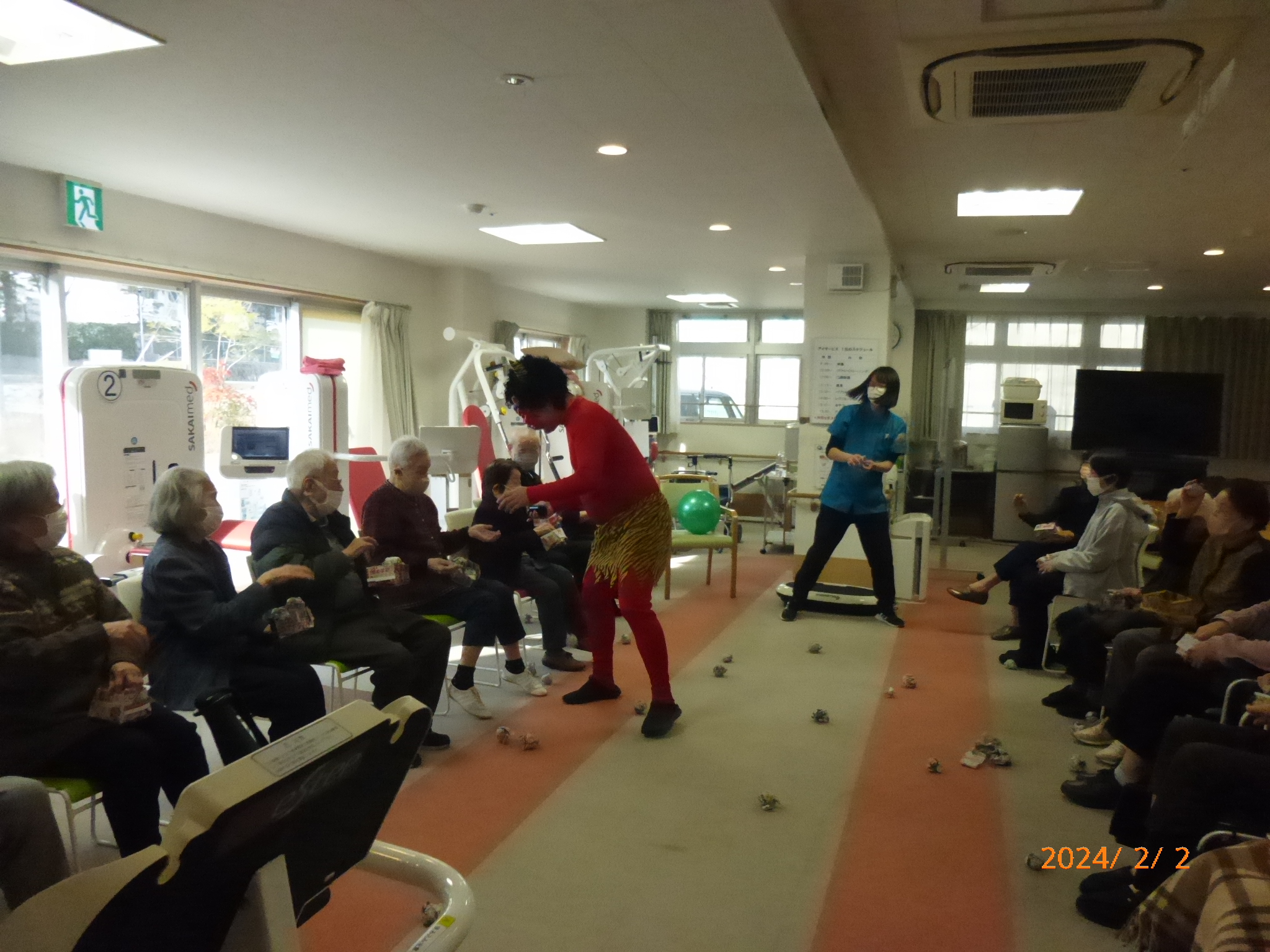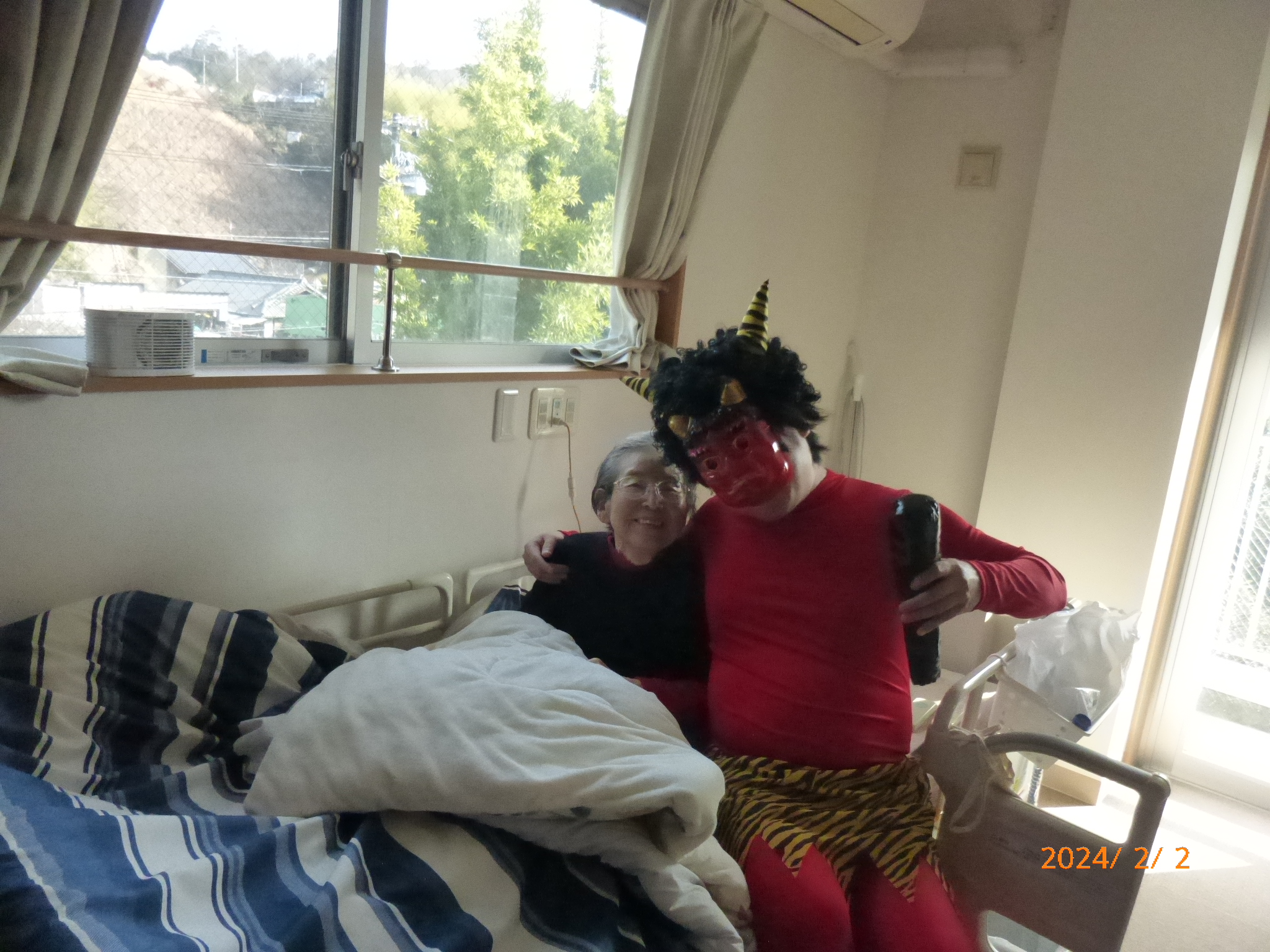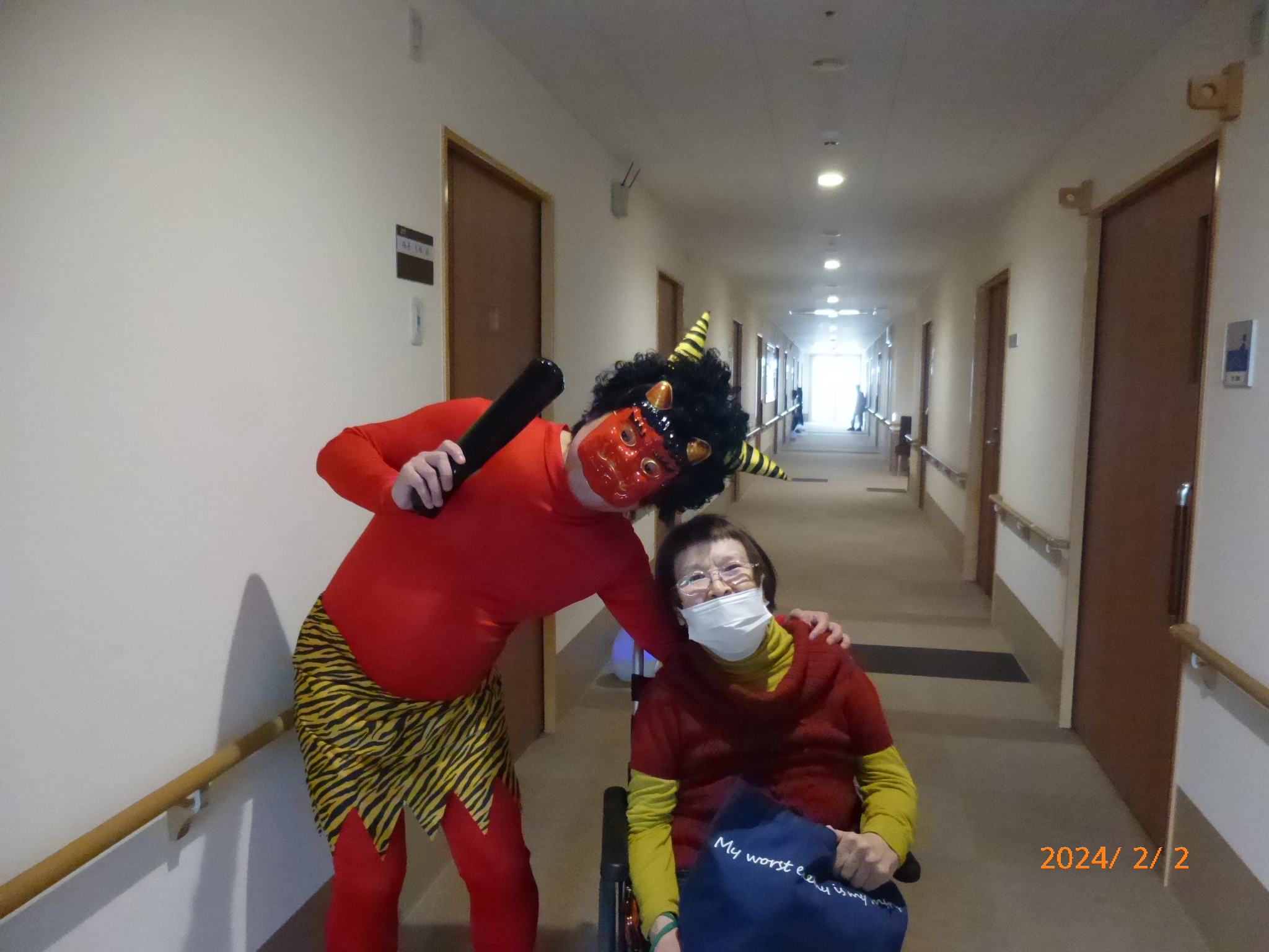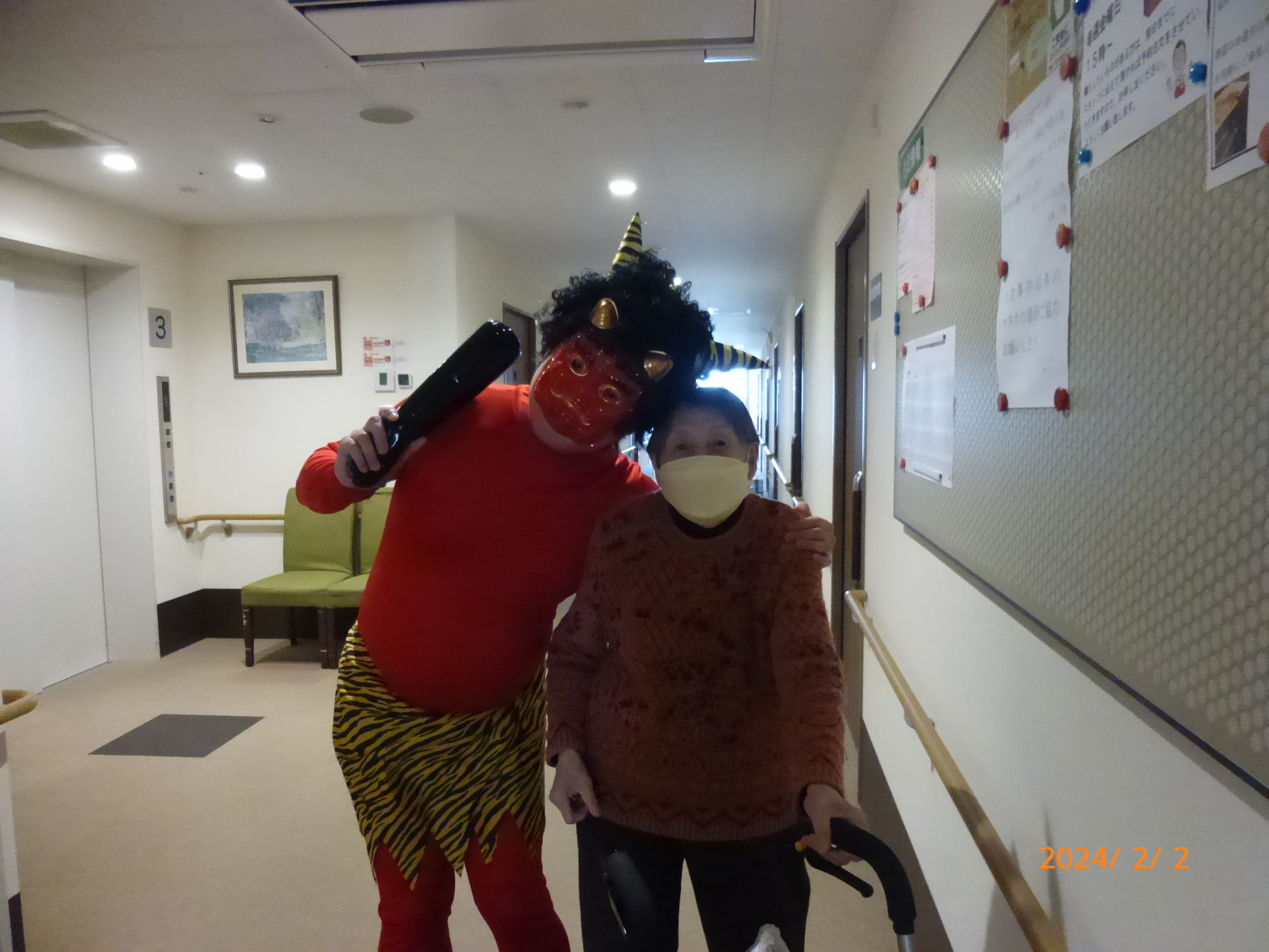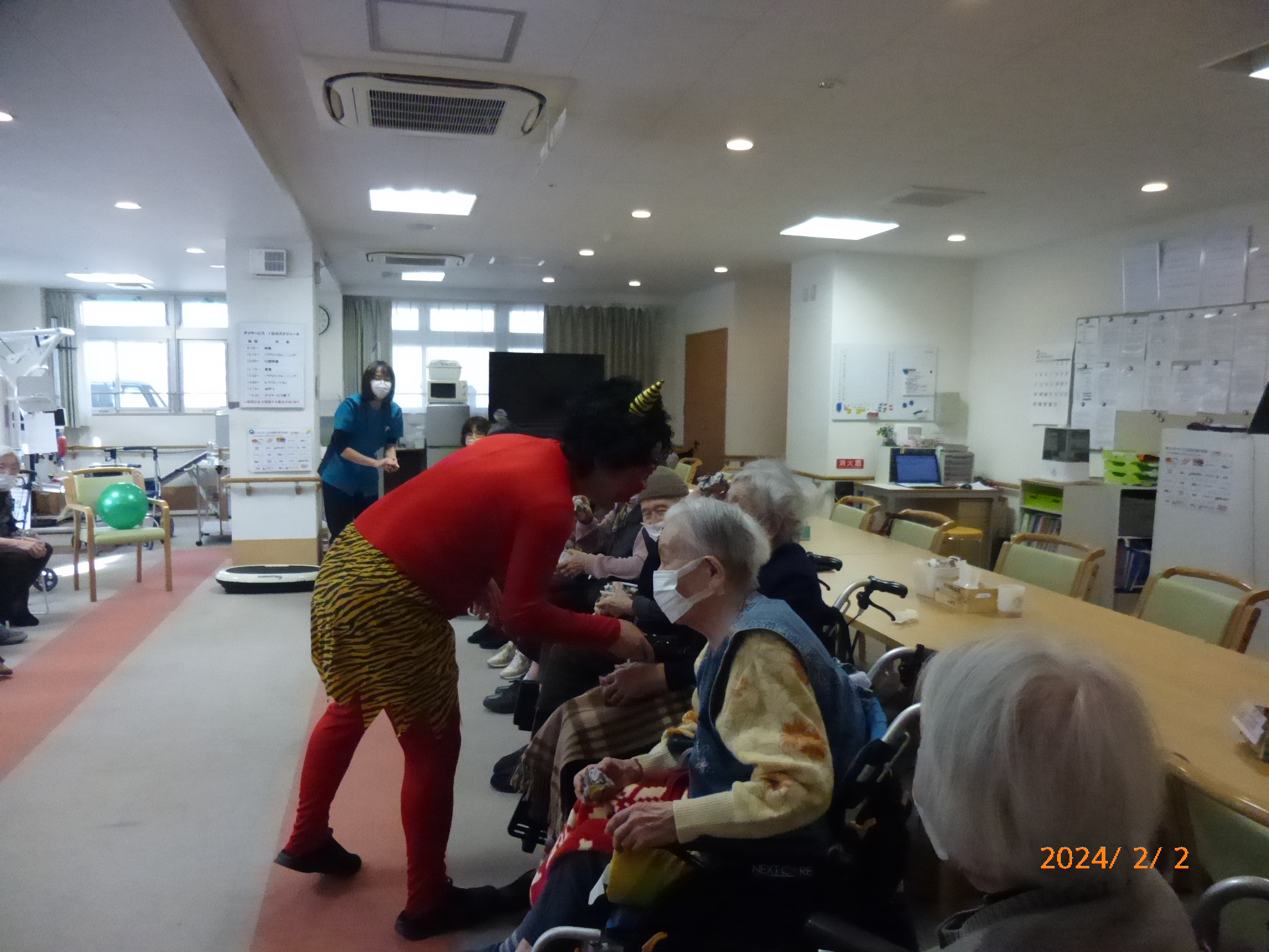 皆様 新聞で作った豆を鬼にしっかりぶつけて、笑顔で楽しんでおられました。