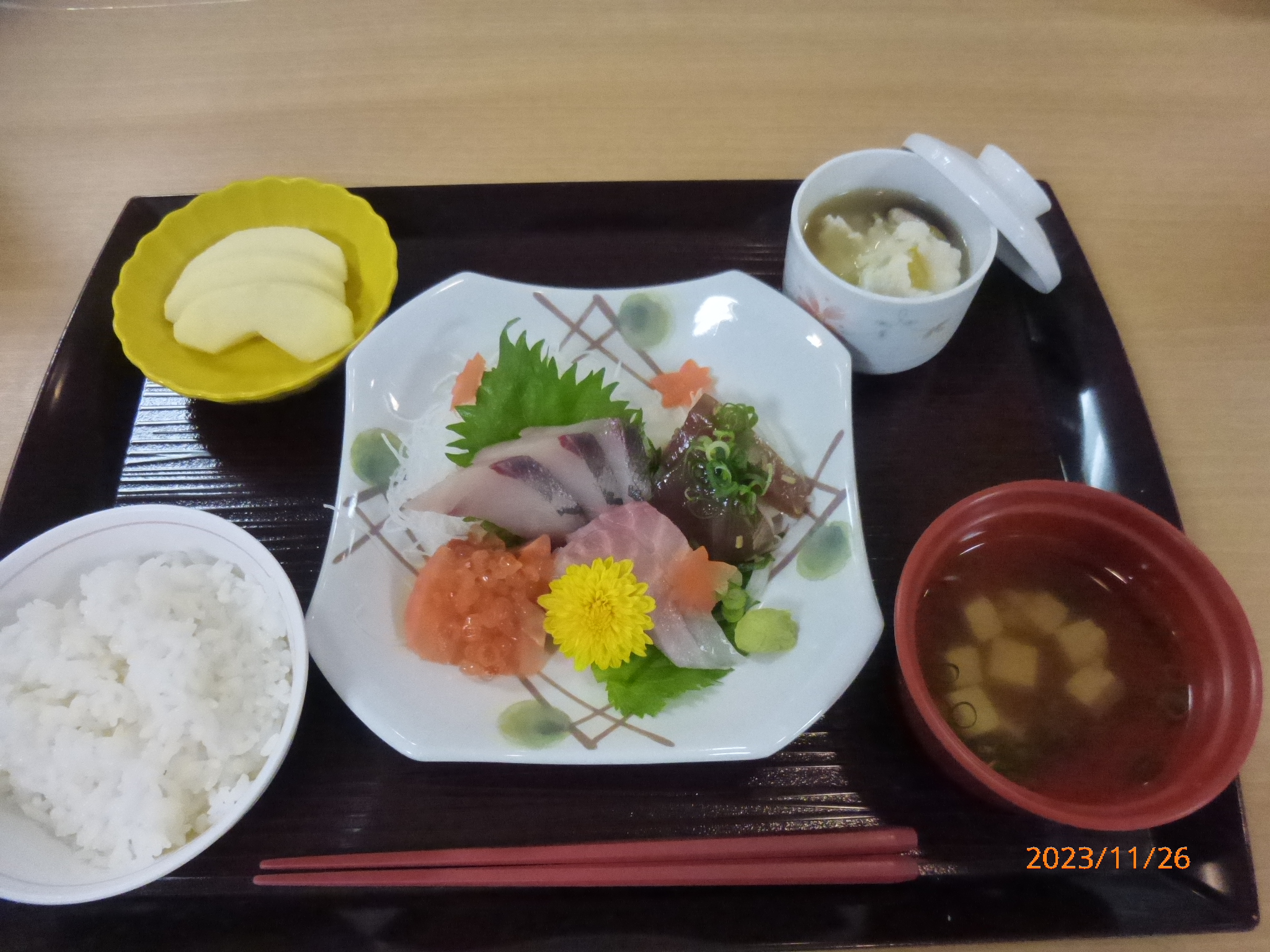 お刺身御膳を提供させて頂きました。 とてもおいしいと喜んで食べておられました。