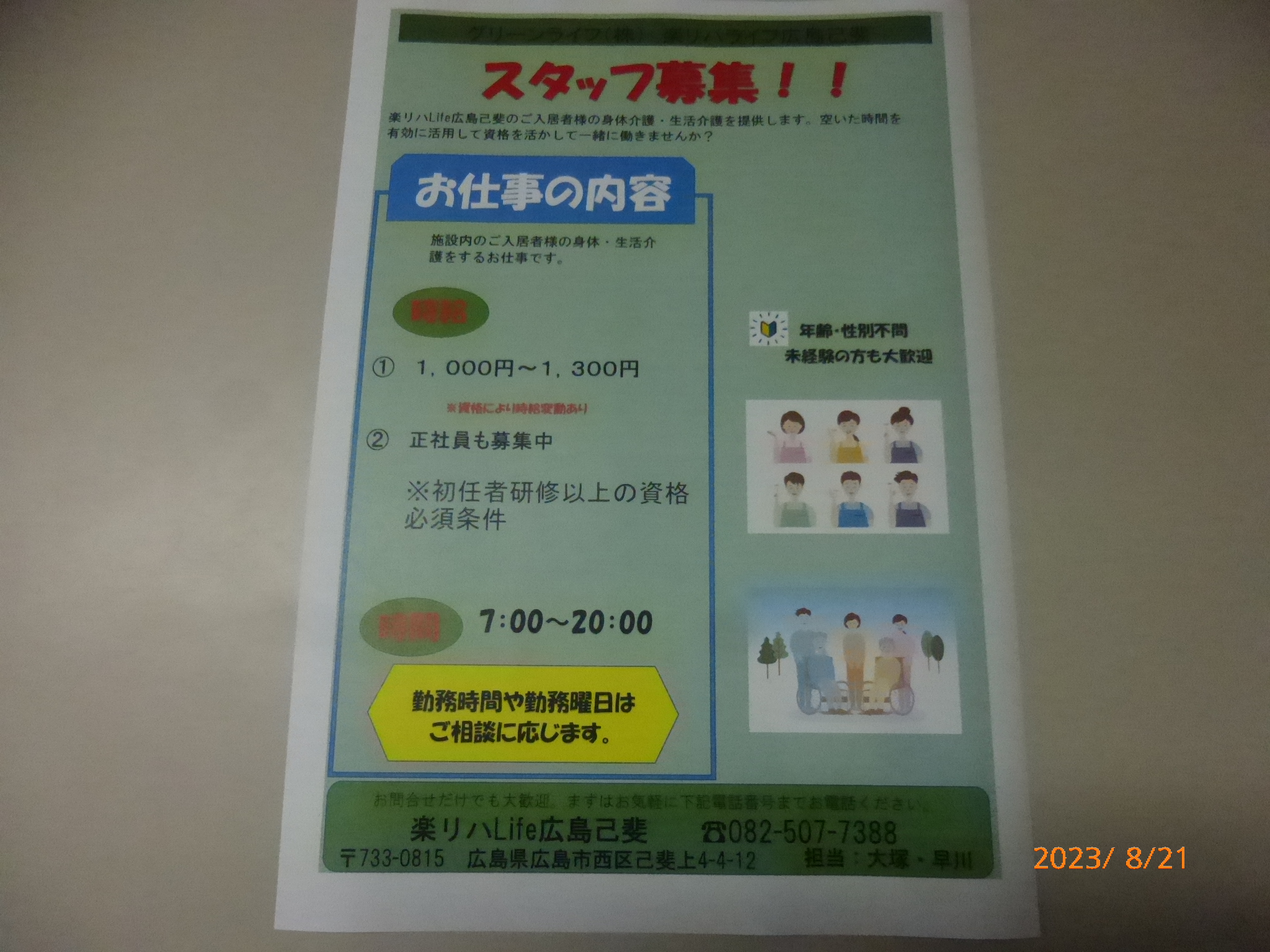 楽リハライフ広島己斐では共に働いて頂ける介護職員を募集中です。