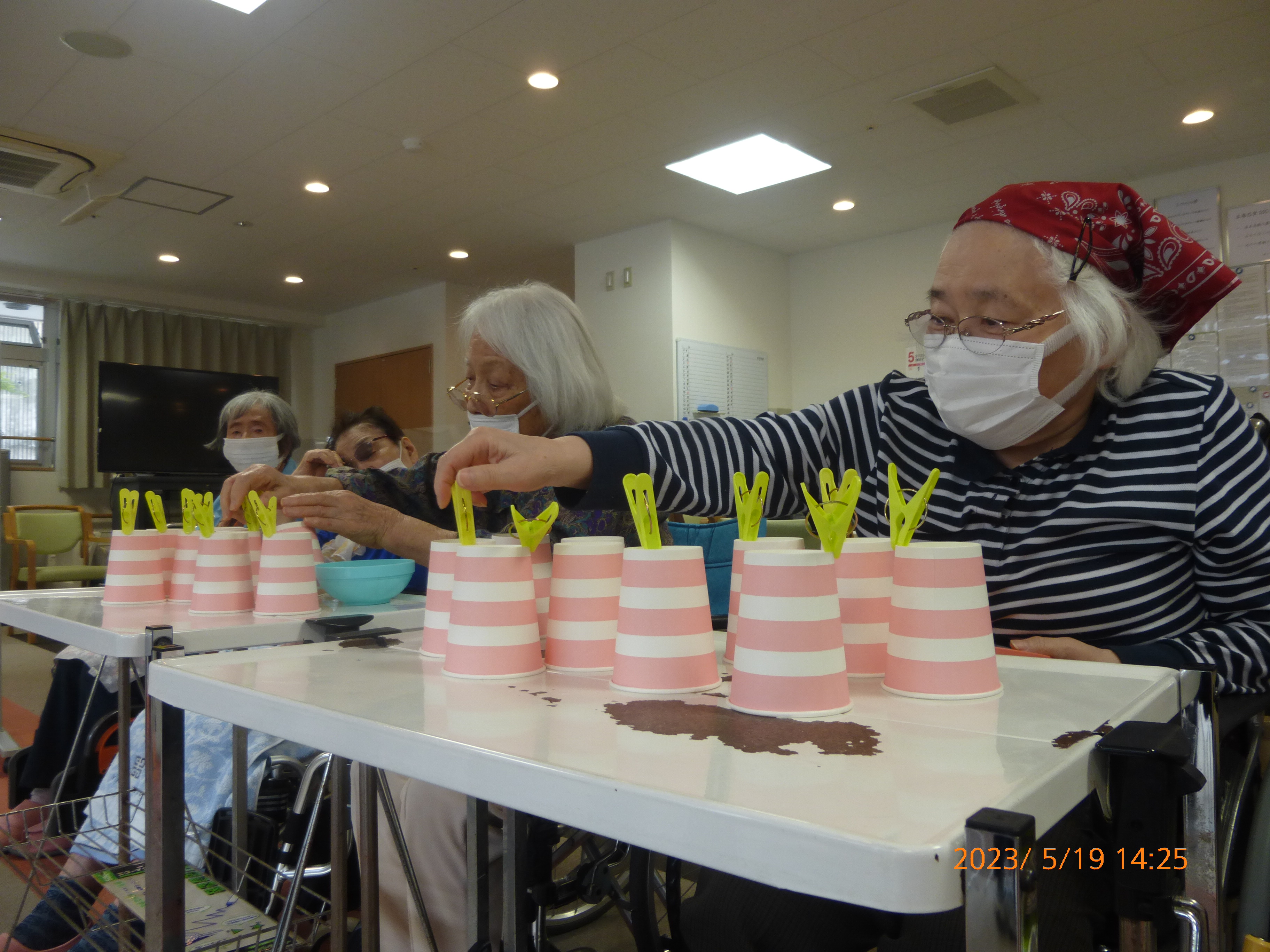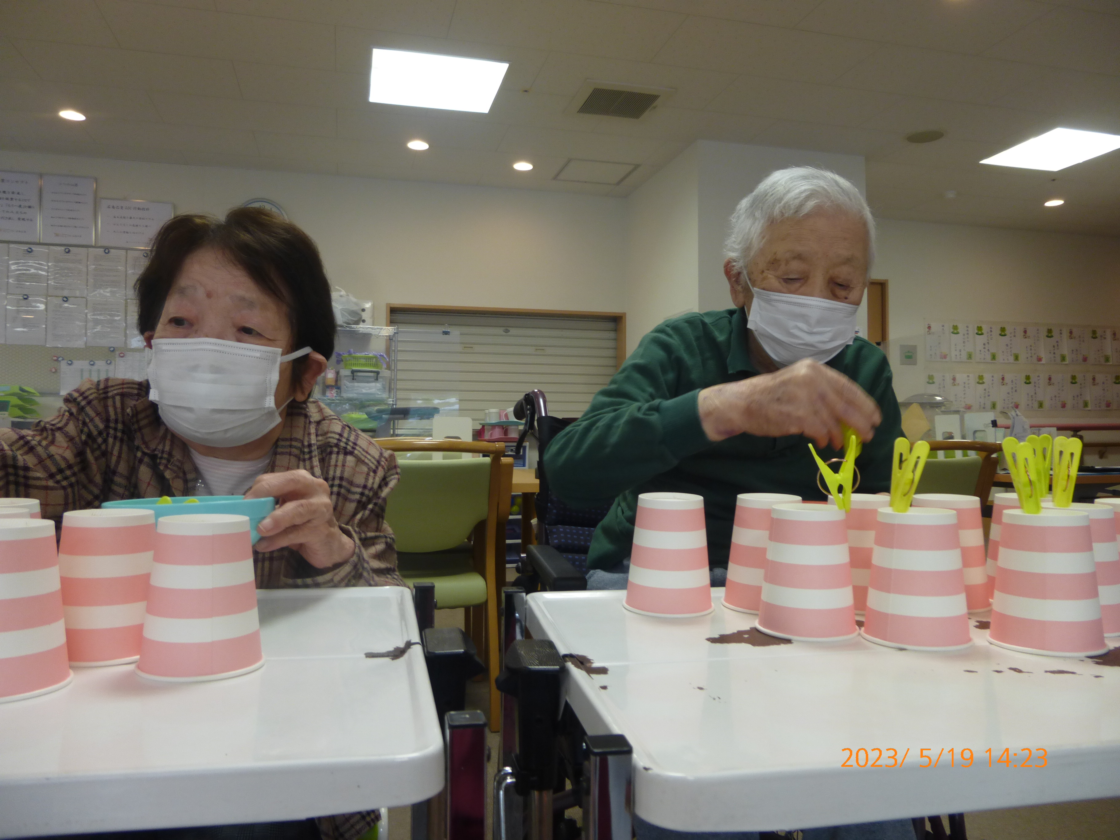 今回は手指の運動にて洗濯ばさみで紙コップをつまむ