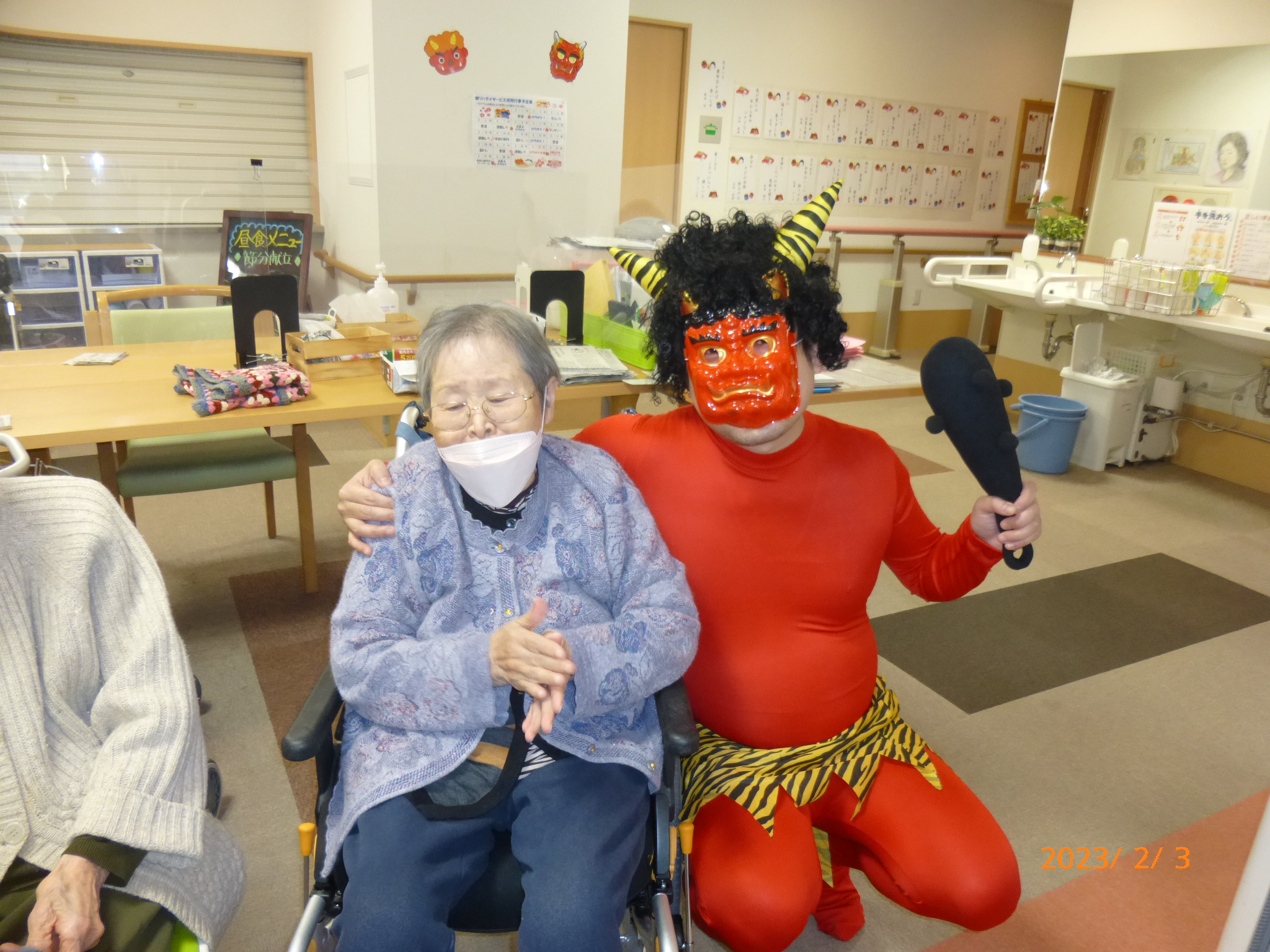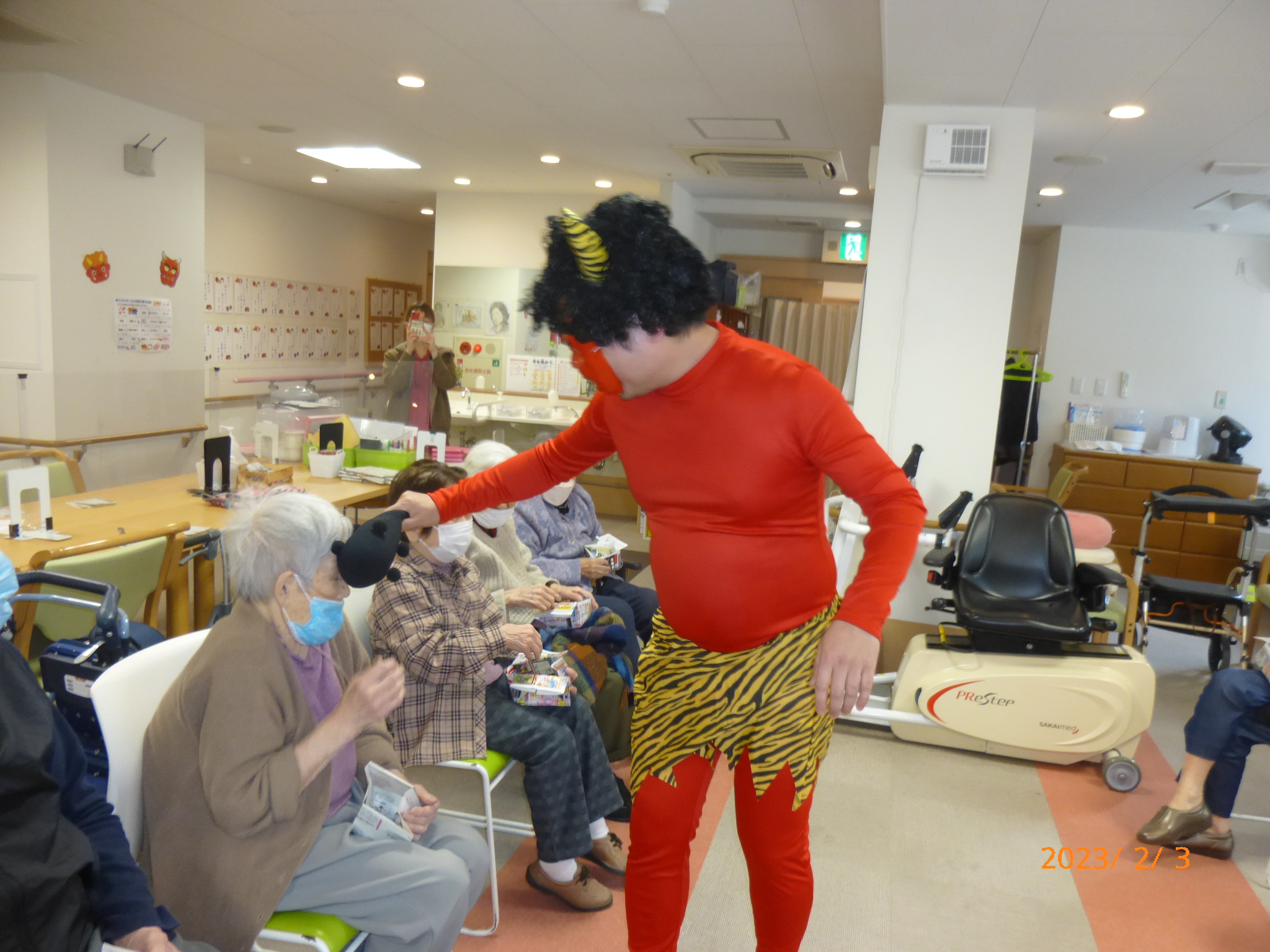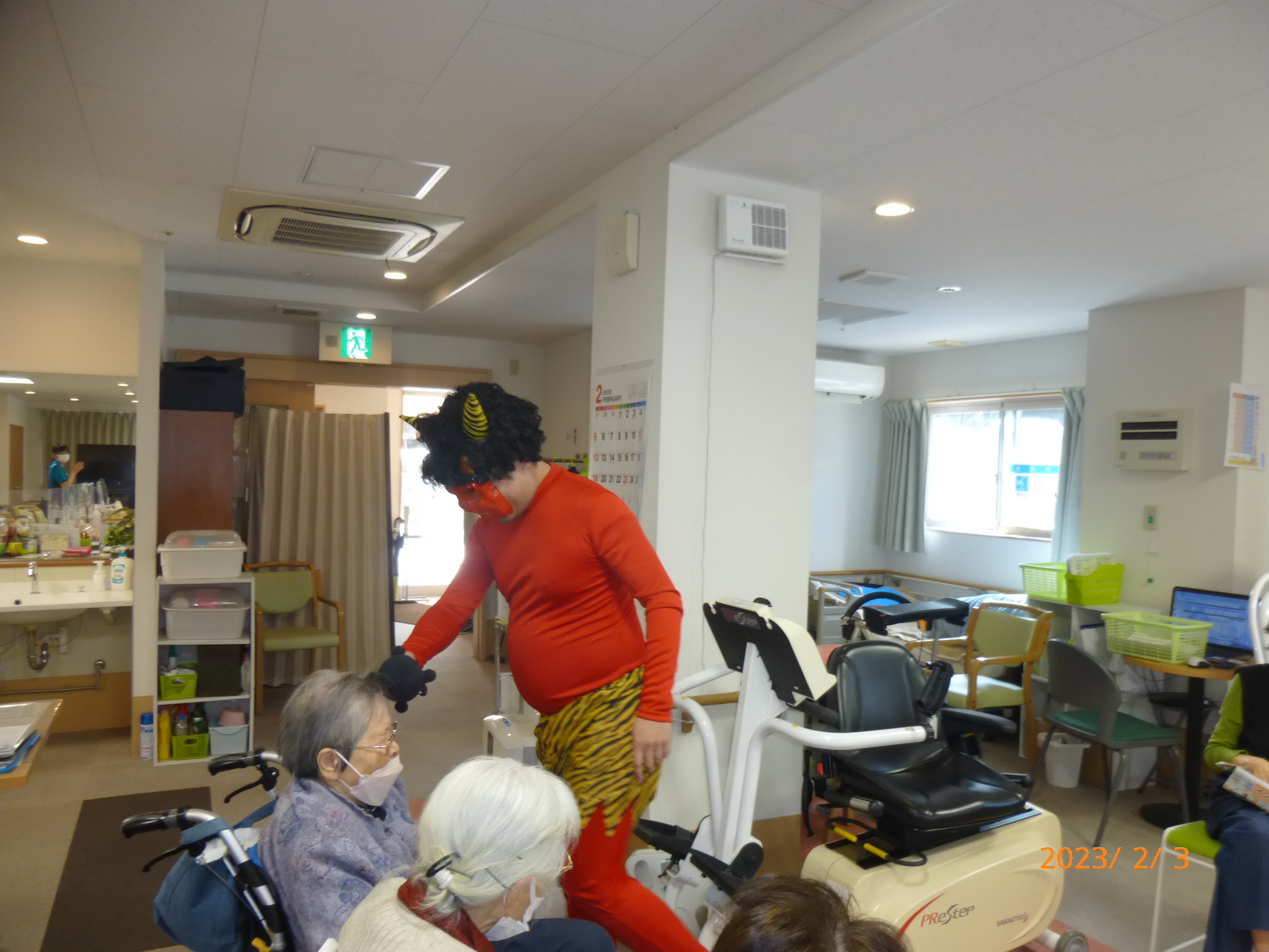 皆様 ご自分で作られた新聞紙の豆を投げて鬼を退治しておられました。