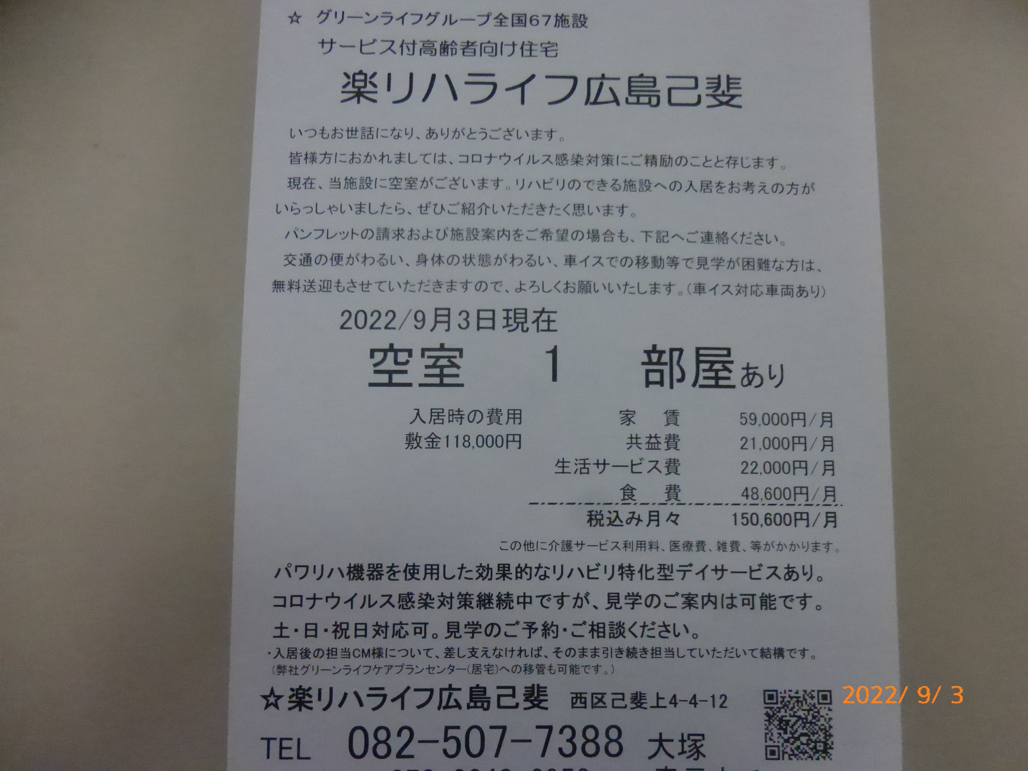 楽リハライフ広島己斐の空室状況について更新させて頂きます。