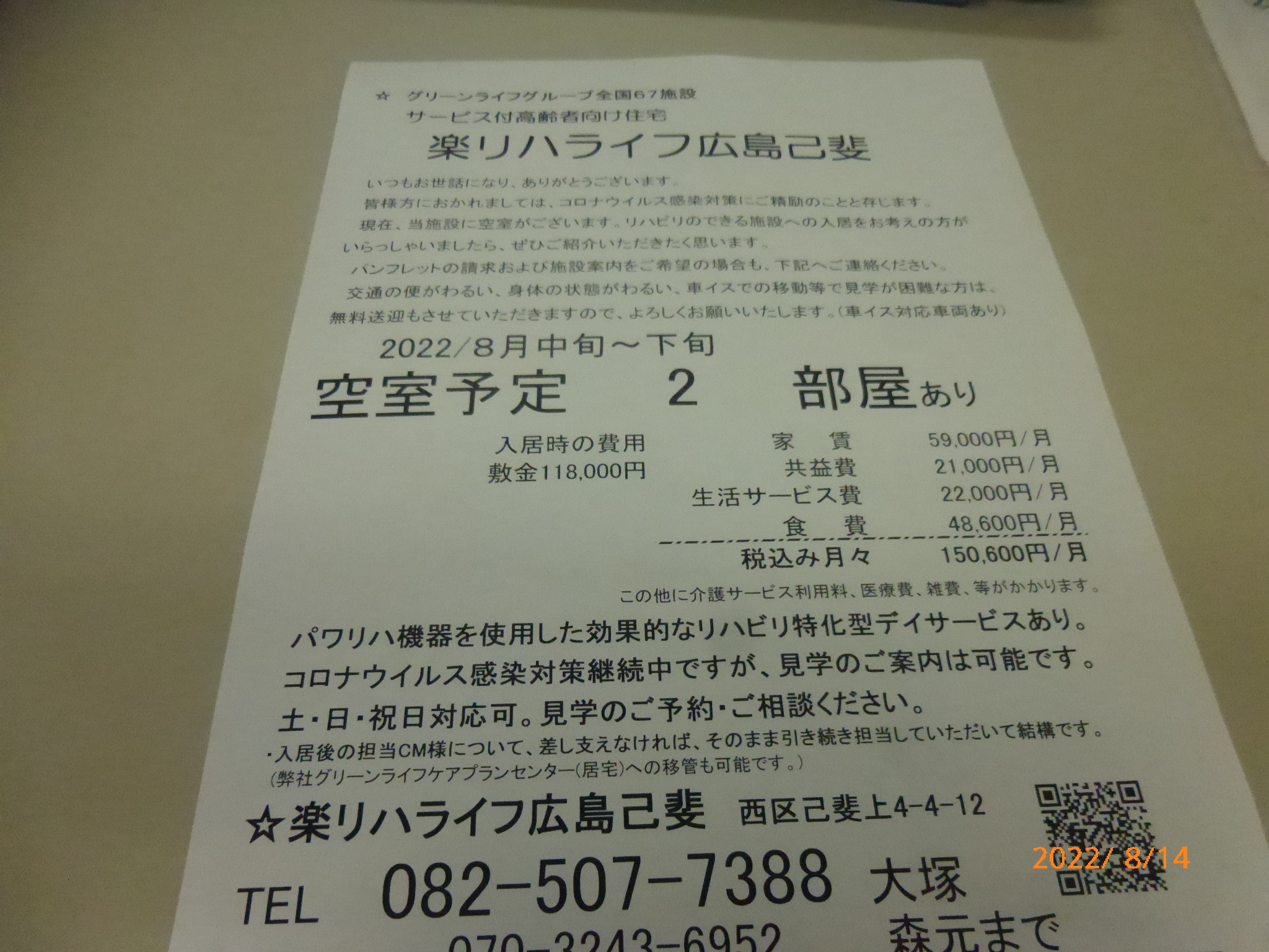 楽リハライフ広島己斐 8月下旬頃~9月にかけて2部屋空きが出る予定となりました。