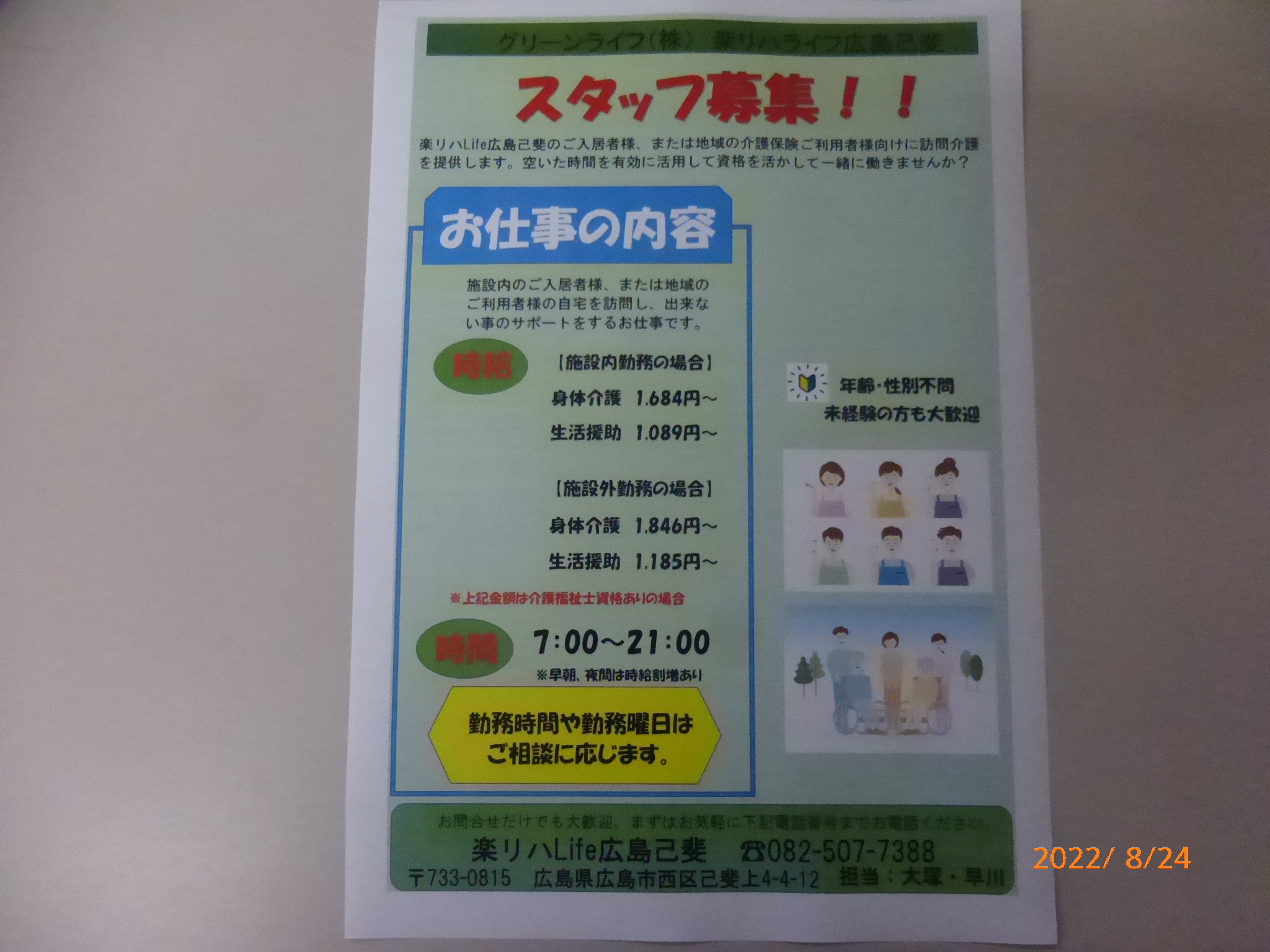 楽リハライフ広島己斐では、一緒に働いて頂けるスタッフを募集しております。
