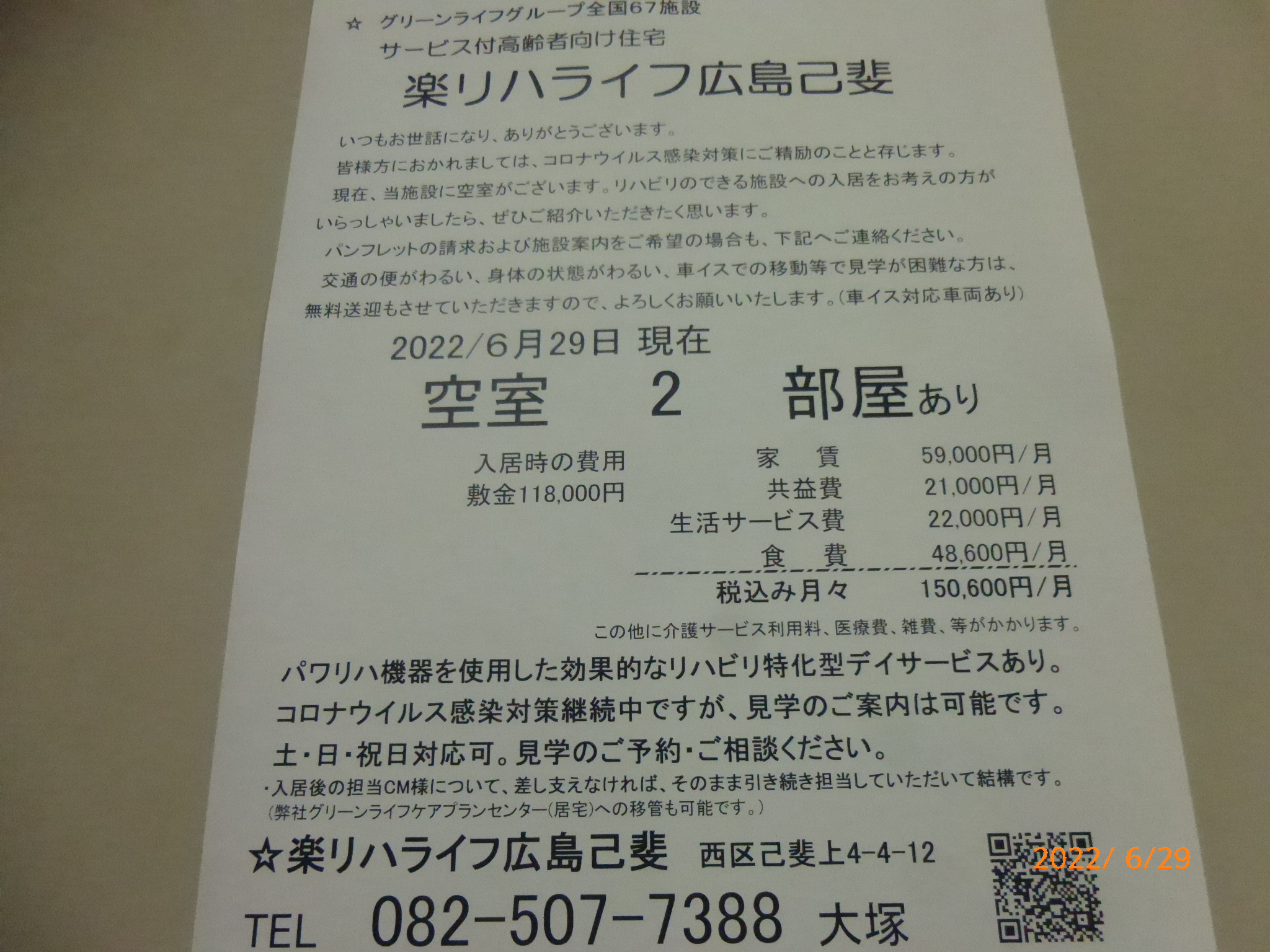 楽リハライフ広島己斐では2部屋 空室の予定が出ましたので