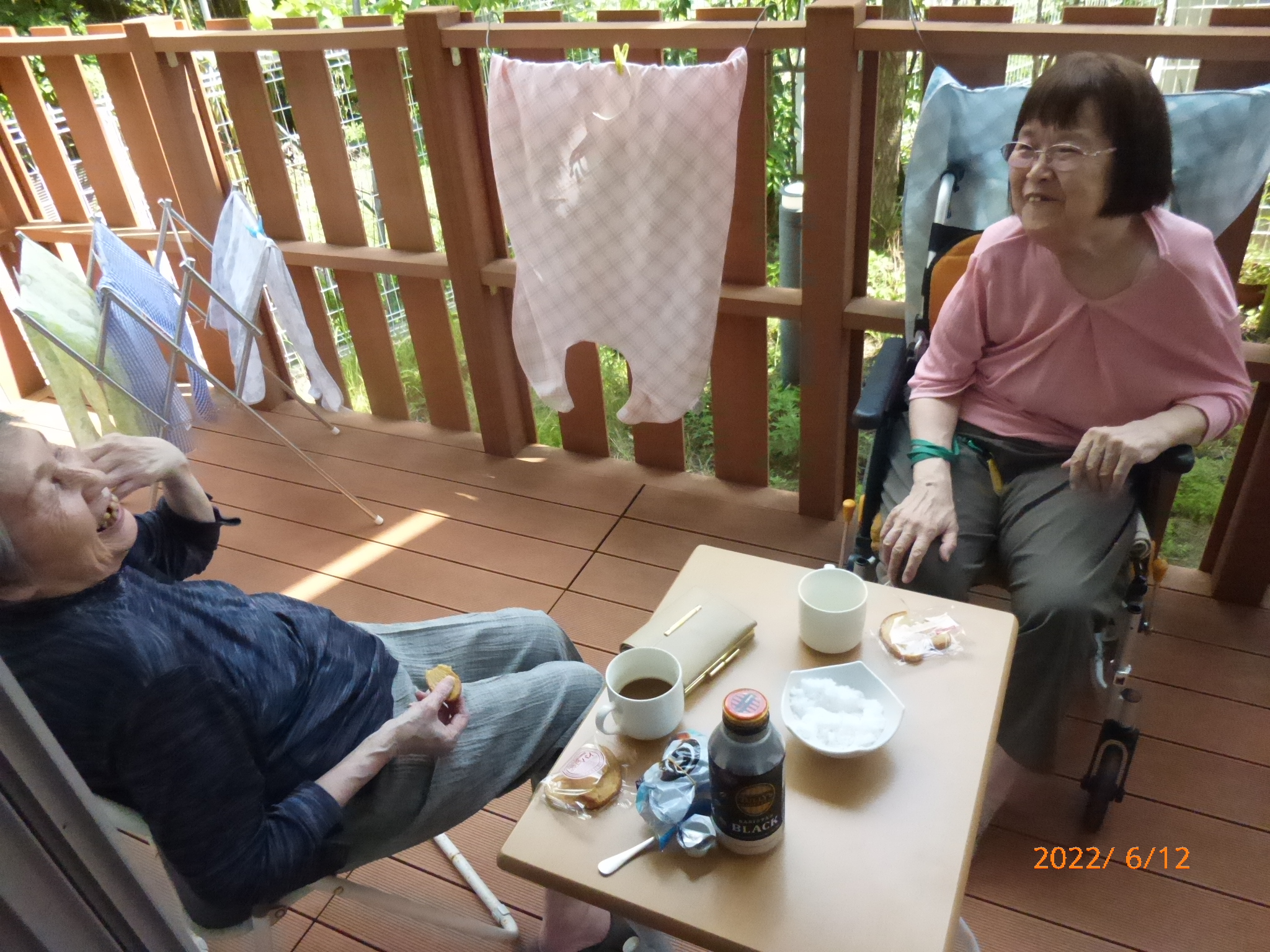 ご入居者様が食堂奥のテラスにてティータイム楽しみながら