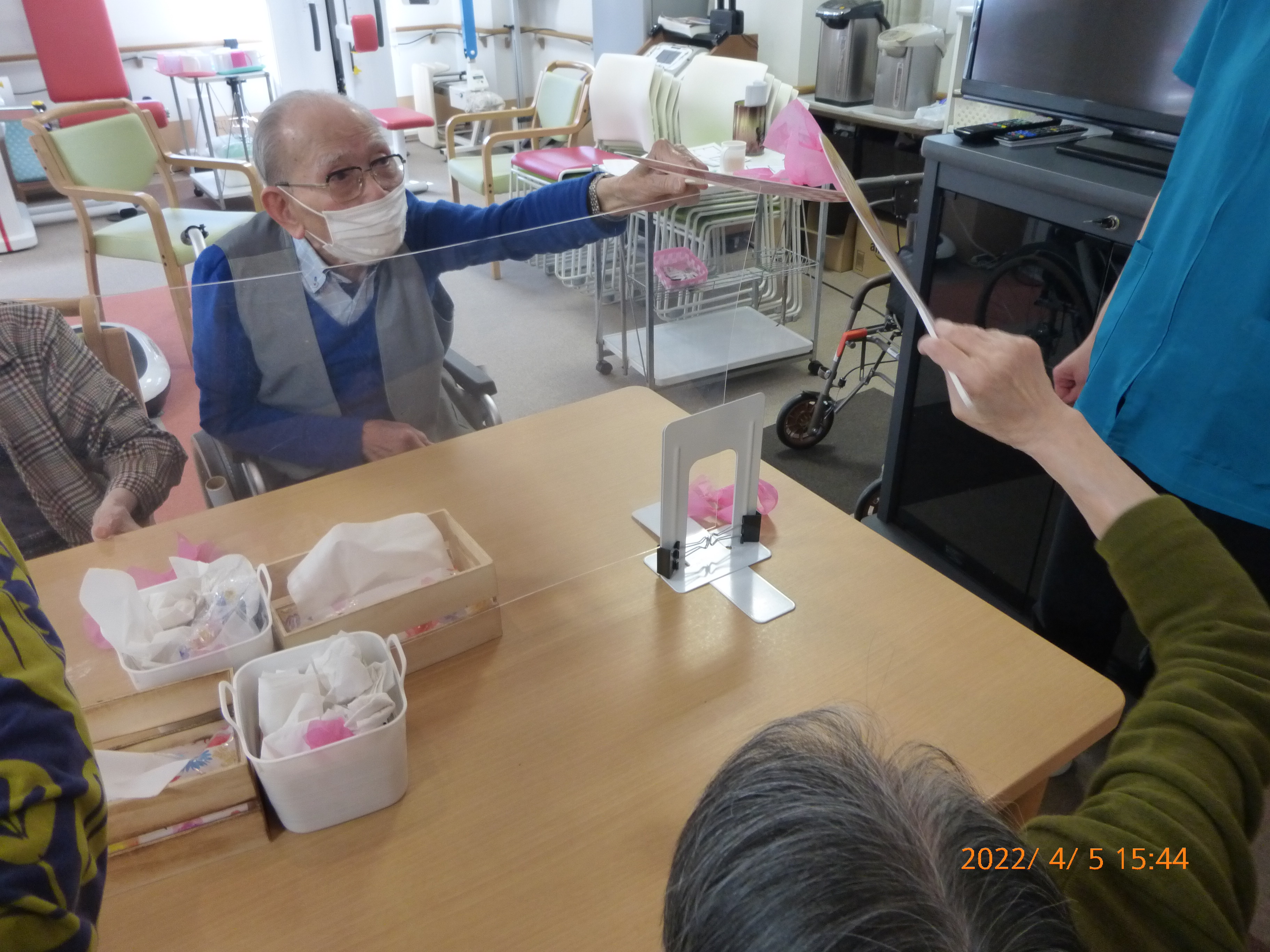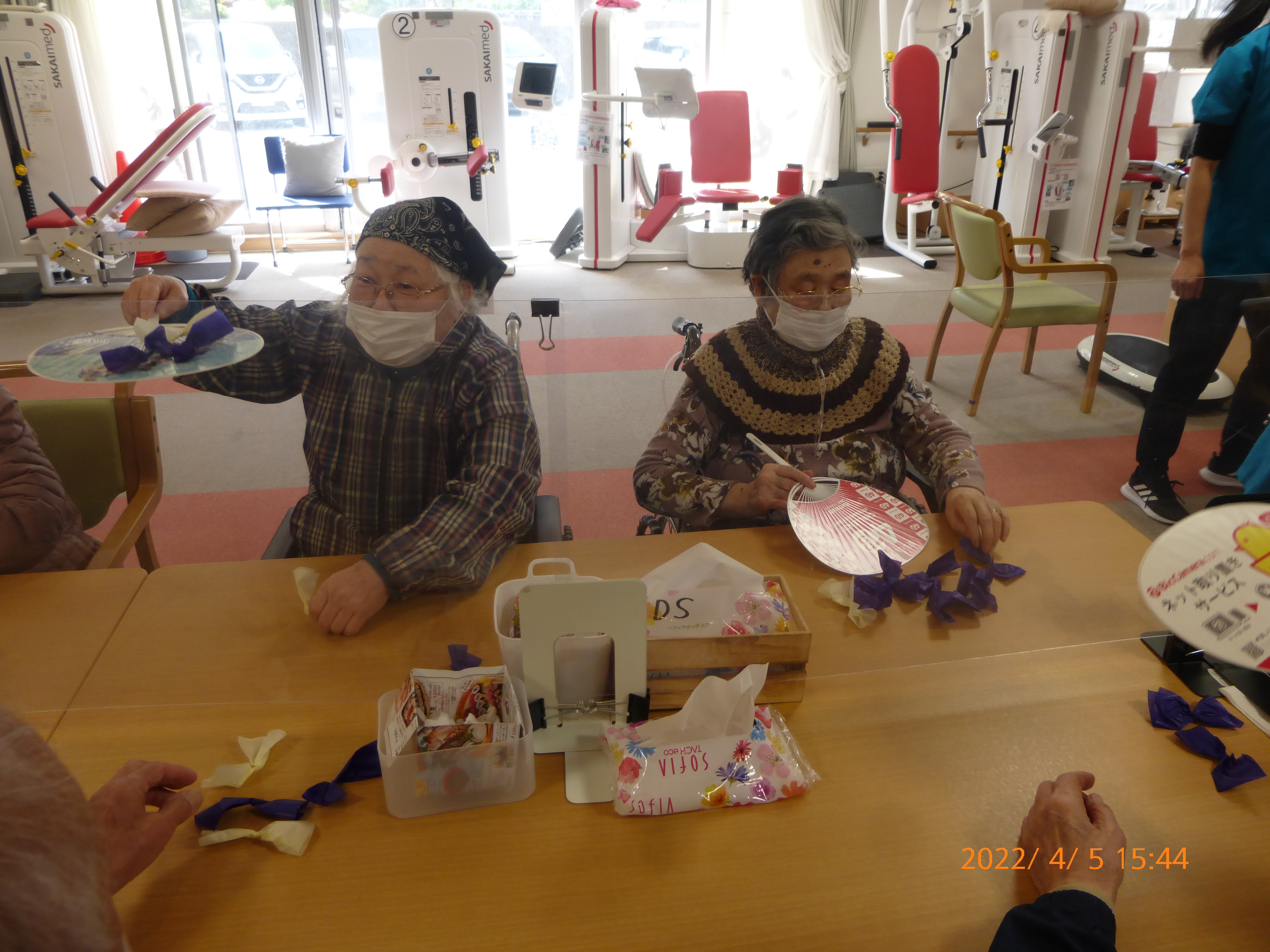 手首の運動もかねて、うちわで花びらを渡す運動を実施させて頂きました。