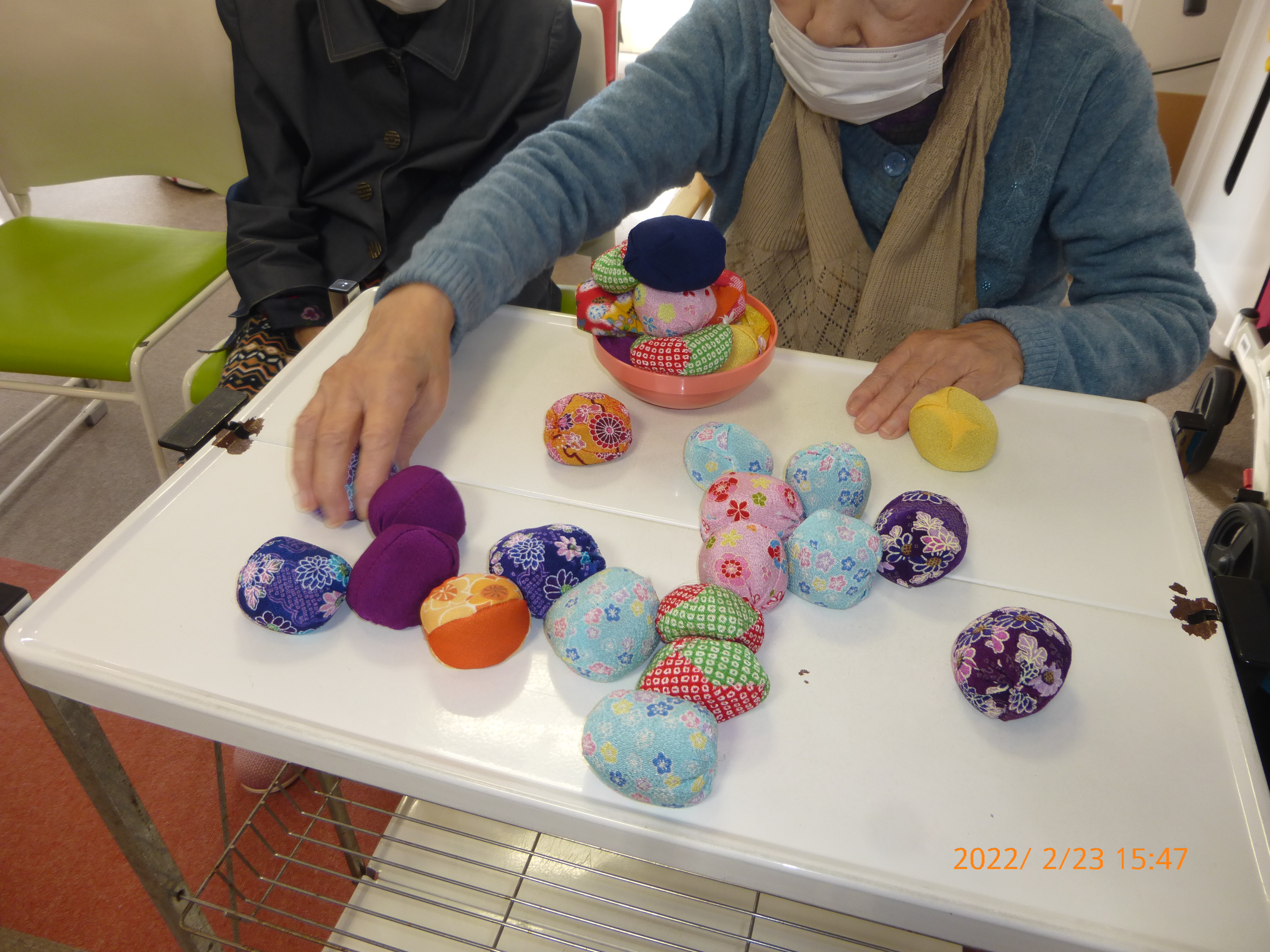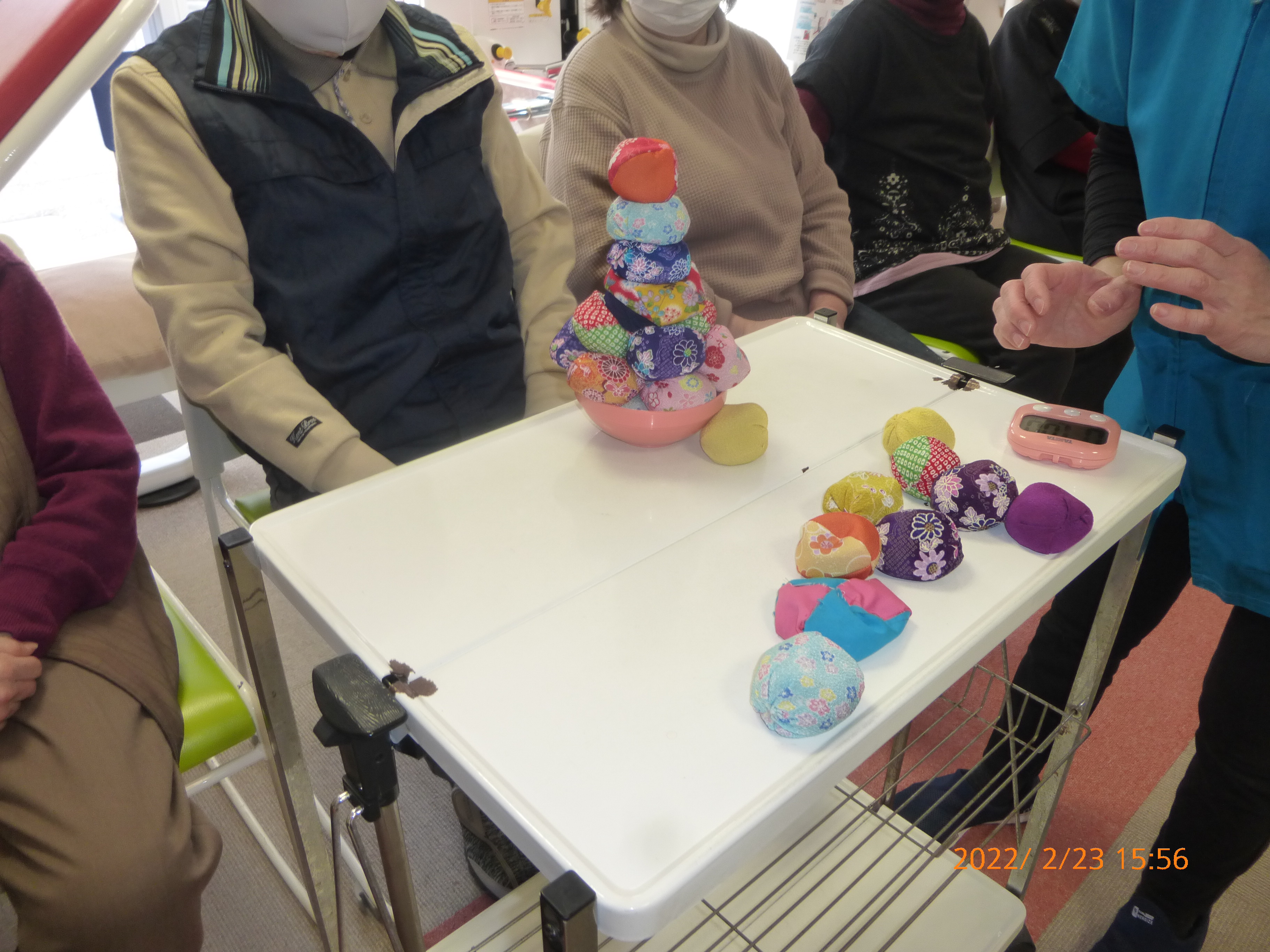 手の運動にてお手玉を使った積み木を実施させて頂きました。