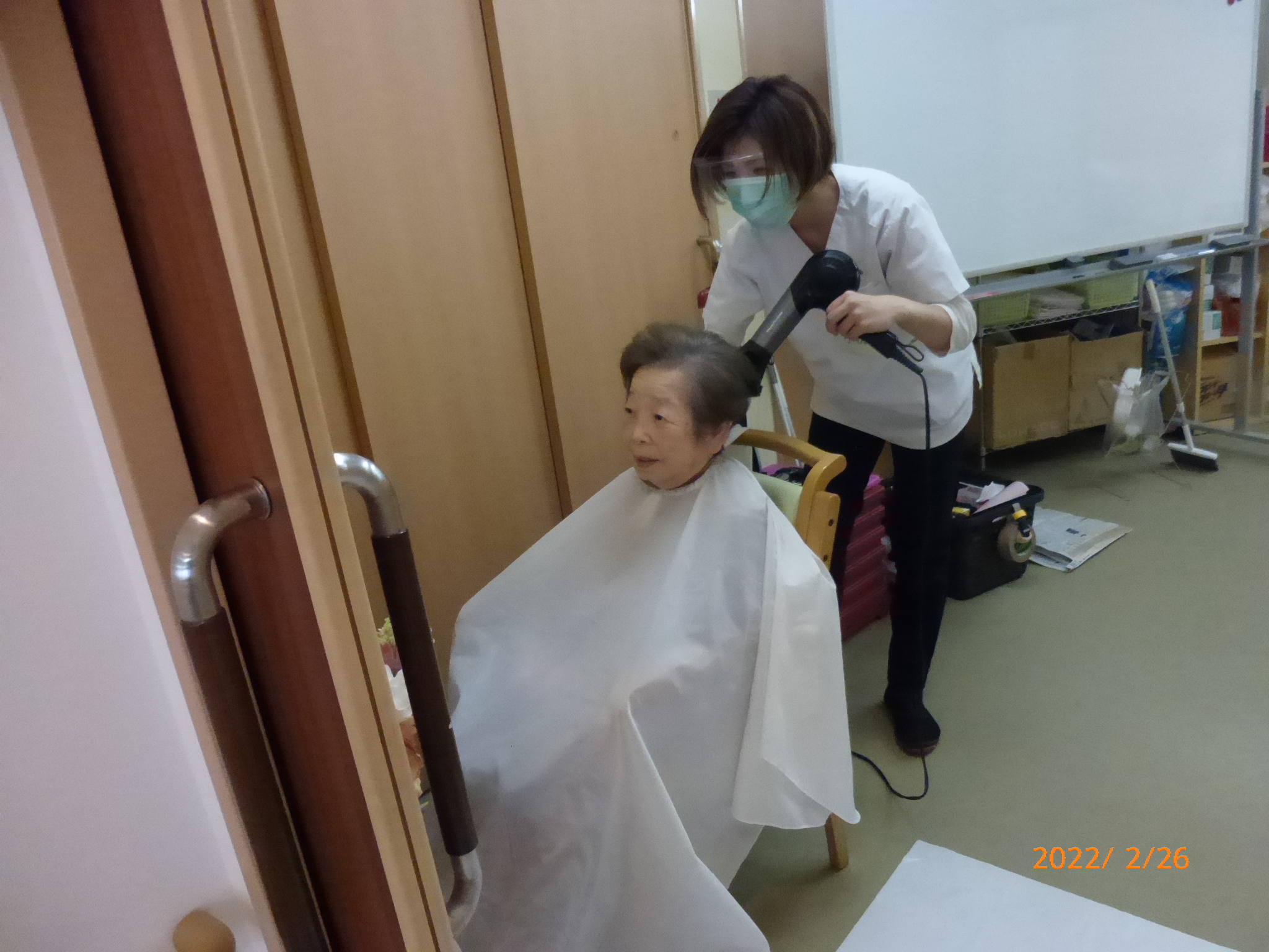 ご入居者の皆様も 楽しみにされておられ カット中は笑顔も出ておられます。
