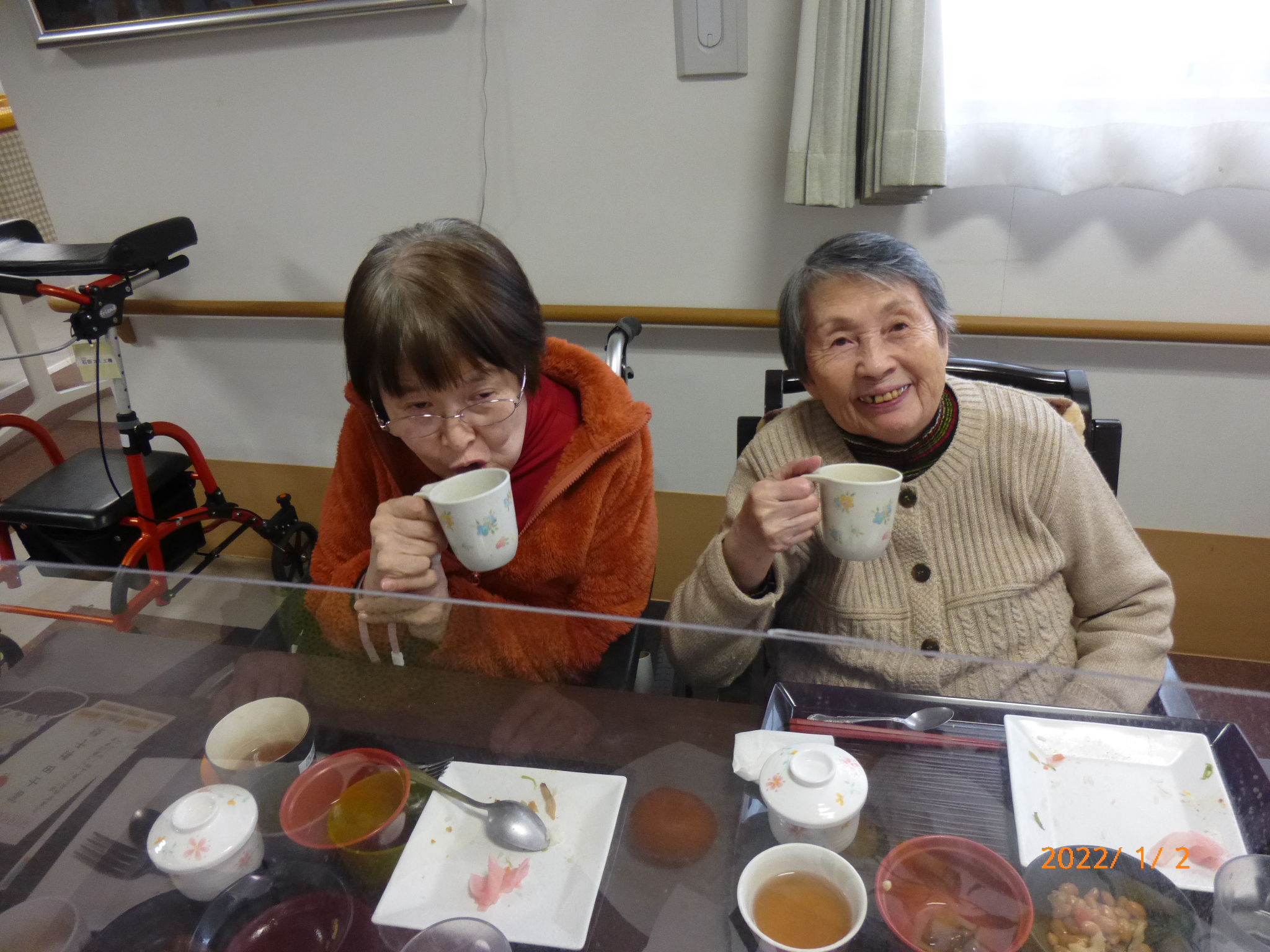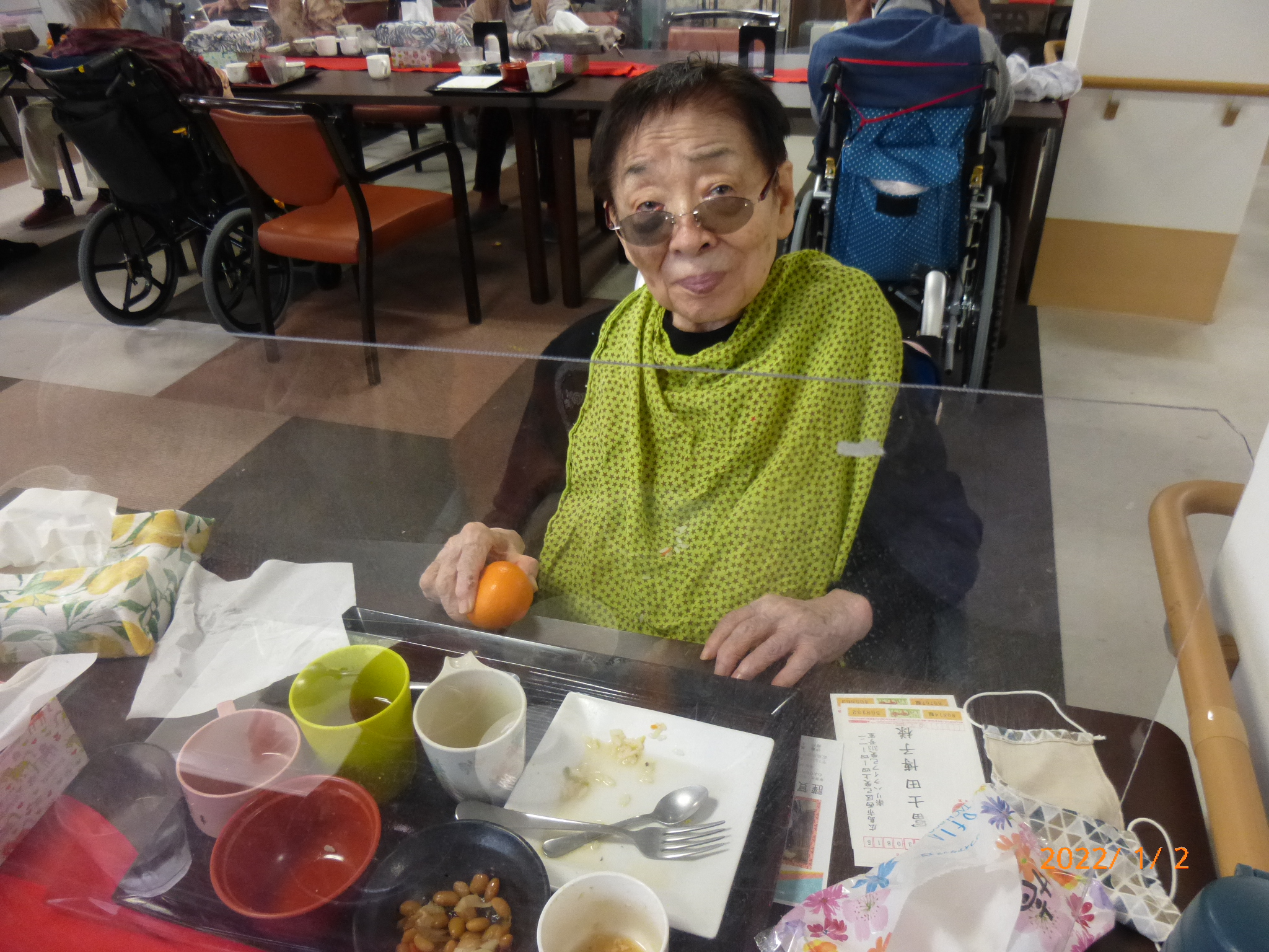楽リハライフ広島己斐では1月2日 昼食後に甘酒とみかんを堪能しながら