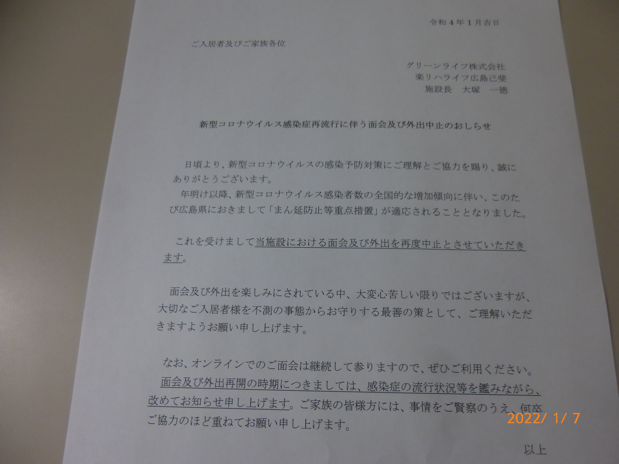 新型コロナウイルス新規感染者が広島県では過去最高の400人越えとなり1月9日~まん延防止重点措置が発令されることに伴い楽リハライフ広島己斐から、御入居者・ご家族様にお願いを申し上げます。