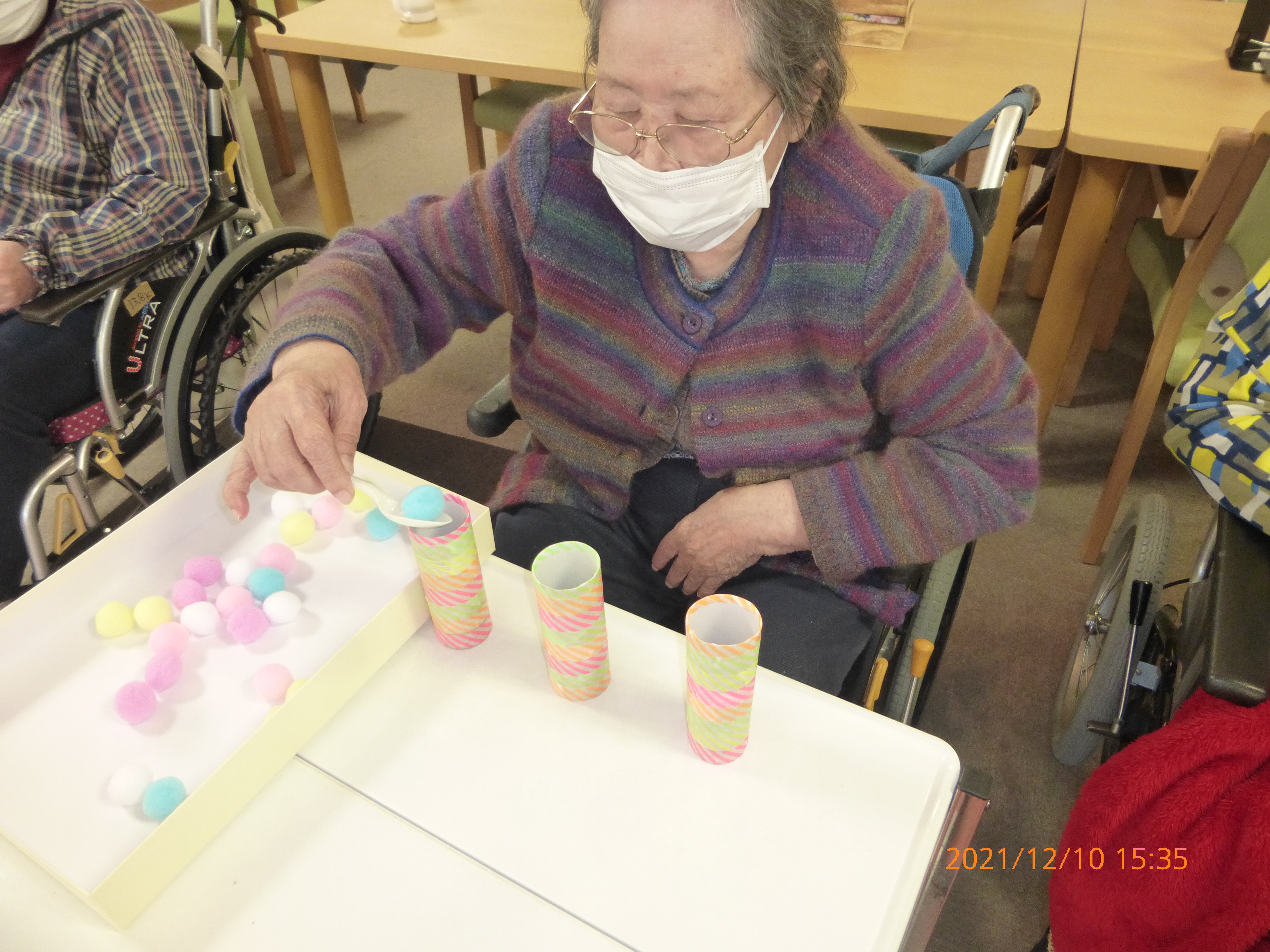 今回は玉投げ・ボール入れを行いました。皆さん上手に球を投げたり、スプーンで球を